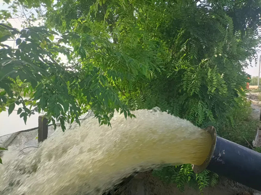 经过干群通力合作,一条十余米长的抽水管在挖掘机的协助下,顺利铺设到饮水河中。从晨光初现到暮色四合,经过连续十多个小时的奋战,当日下午,抽水泵终于轰鸣启动,清澈的河水通过管道汩汩流入干涸的灌溉河道。