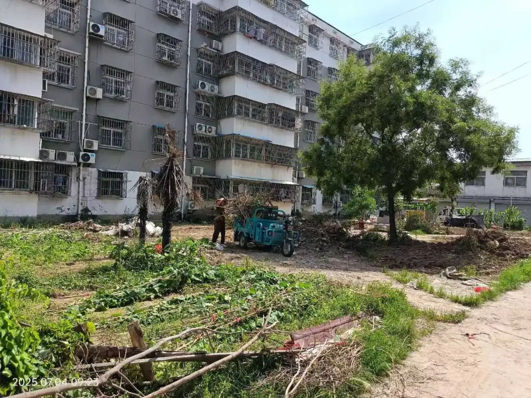 行动前期,大许村委会协同镇执法局充分研讨,制定整治方案,广泛征集业主意见并动态跟进反馈。随后,通过线上通知、语音宣传等多种方式,积极倡导居民主动清理侵占绿地的私家菜地,但自行整改效果有限。为切实保障小区环境与安全秩序,村委会联合镇综合行政执法局组建专项工作队,依法对圈占公共空间的种植乱象开展集中清理。经过有序推进,累计清除多处违规菜地,成功释放被长期侵占的公共区域,为后续空间优化奠定了基础。