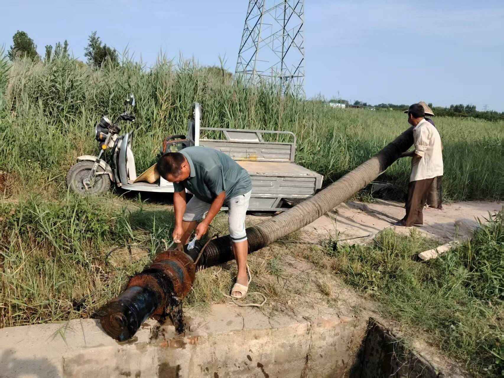 大彭村现有水稻种植1000余亩,灌溉系统是生产命脉。近年来,由于管道老化、淤泥积累,部分水泵管道出现严重堵塞,导致灌溉水流不畅,影响农作物灌溉效率。同时,随着雨季临近,管道不畅可能引发内涝风险,威胁村民生命财产安全。