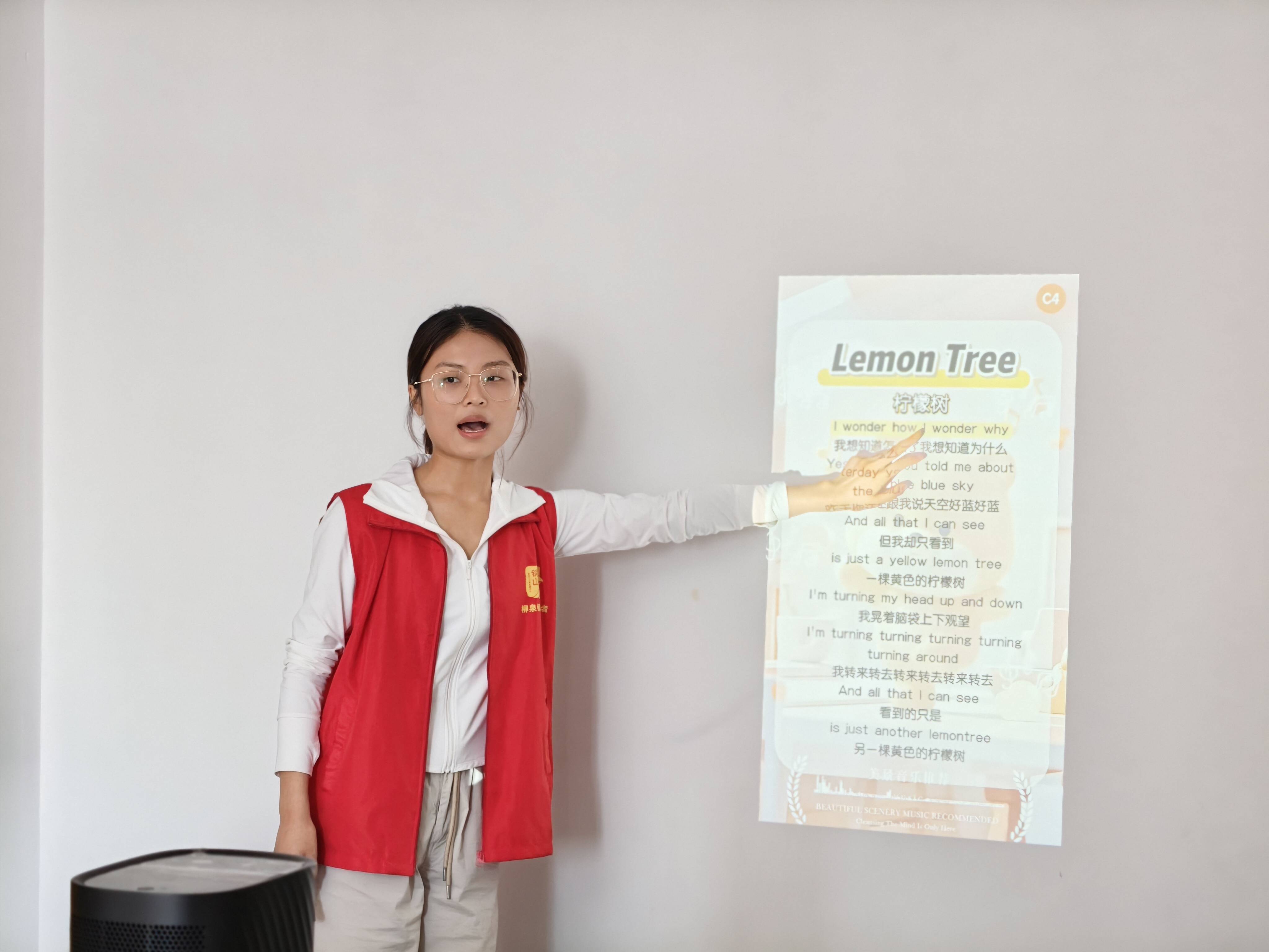 面对初次接触的英文歌词,孩子们眼中满是好奇与些许无措。志愿者们从耳熟能详的《Lenmon Tree》旋律切入,瞬间点燃课堂热情。 教学时,成员们逐词逐句耐心带读。当遇到发音难点,他们俯身靠近,指尖轻点歌词,用清晰生动的口型反复示范。听见某个发音略显生涩,便微笑着温和纠正,用掌声肯定每一次微小的进步;当孩子终于勇敢地完整唱出一句,真诚的赞美即刻抵达心间。