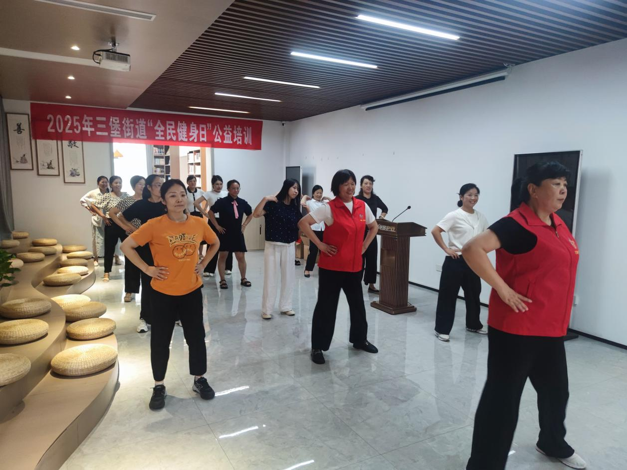 近日,三堡街道文体站举办了一场以“全民健身”为主题的志愿服务活动,活动组织各社区(村)的社会体育指导员,为辖区广场舞爱好者开展健身舞公益培训,为居民送上了一份‘健康大礼’”