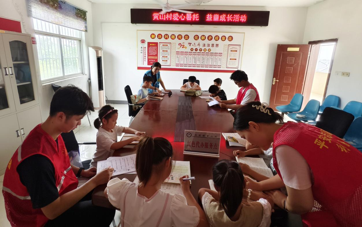 辅导班选址于宽敞明亮的村委会活动中心,安全舒适的环境为孩子们提供了理想的学习空间。聚焦家长关注的暑期学习问题,黄山村特别开设“作业小课堂”:由村里考上大学的大学生志愿者组成服务团队,根据学生年级和学科需求,量身定制作业计划,一对一解答难题、巩固知识,帮助孩子们高效完成暑期作业,夯实学习基础。