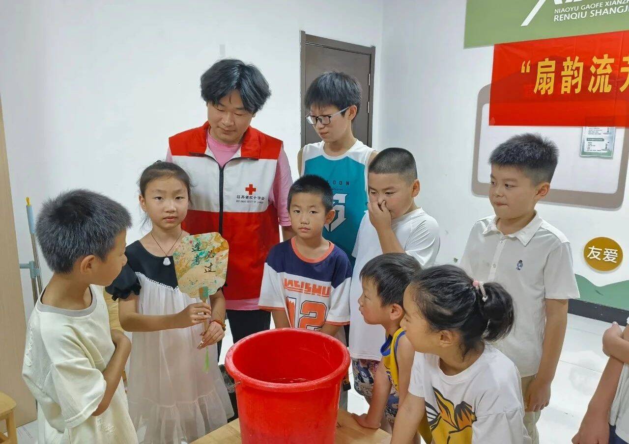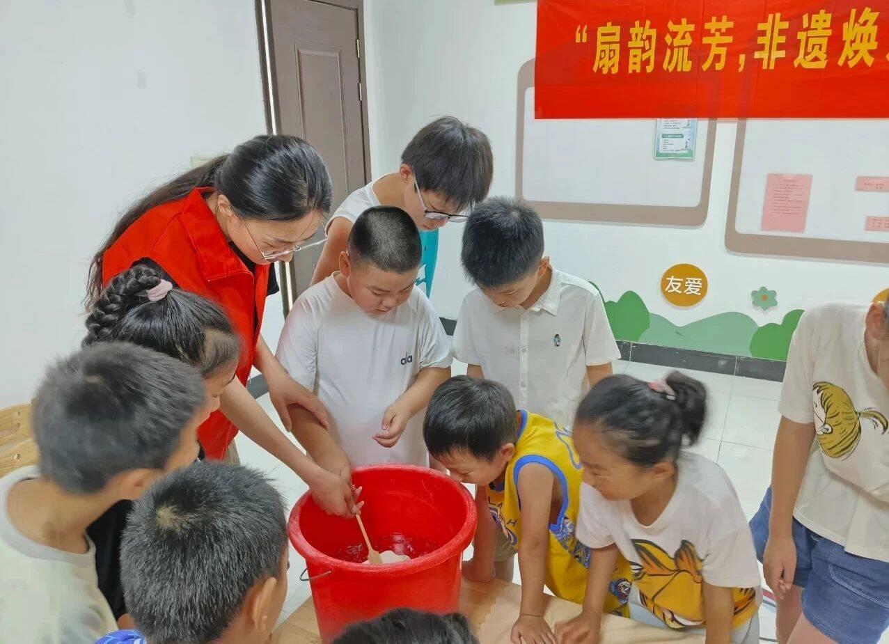 志愿者向孩子们介绍了漆扇的历史渊源、文化内涵以及制作过程中的关键技艺,包括漆料的选择、扇面的处理、颜色的搭配等,并现场演示了漆扇制作的基本步骤和技巧。孩子们来到水桶前,有序地开始创作。一件件亲手制作的漆扇,让传统技艺焕发出别样的风采。