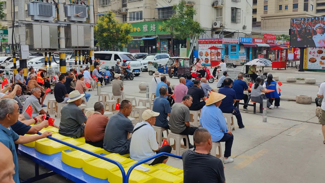 在悦彭夜市的大屏前,大刘村志愿者组织村民来到户外一同观看大会。村民们早早就来到了指定地点集合,怀着崇敬的心情翘首以盼大会开幕,当作战方队进入检阅环节,现场气氛瞬间热烈起来,观看活动的村民们纷纷用力挥舞起手中鲜艳的五星红旗。大屏幕上,受阅部队步伐整齐划一、气势磅礴,各种先进的武器装备依次亮相,这一幕幕无不彰显着祖国的强大实力和人民军队的威武雄姿,看到这些,村民们的脸上洋溢着自豪的笑容,眼中闪烁着对祖国无限热爱的光芒。