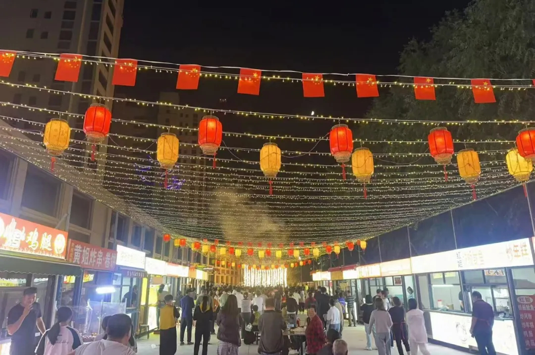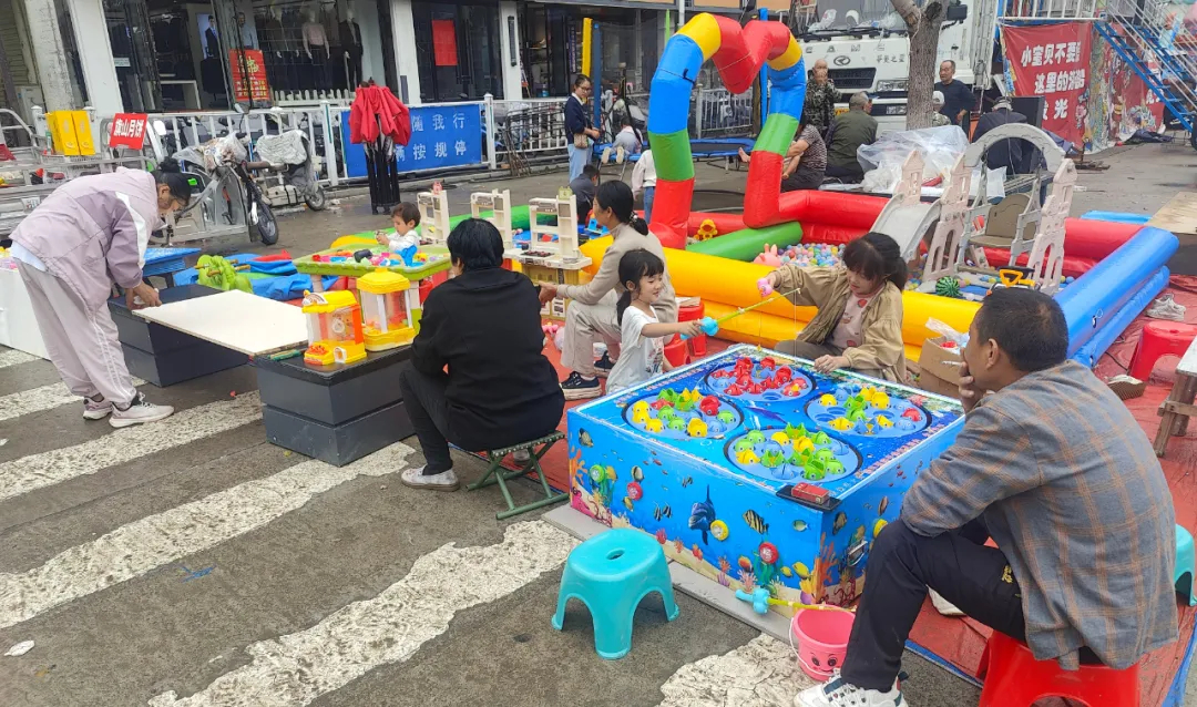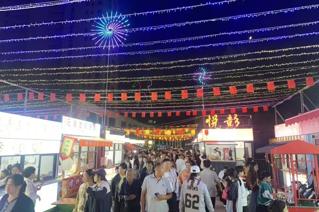 步行街巧妙构建起“日间亲子游乐+夜间美食市集”的多元消费场景。白天,幸运大转盘、蹦蹦车、套圈等经典项目轮番上阵,成为孩子们流连忘返的乐园,也为家庭游客带来了阵阵欢笑。夜幕降临后,悦彭夜市华灯绽放,音乐缭绕,各色摊位林立,迅速汇聚成夜间人气高地,炸串、手撕鸡与各类特色小吃的香气交织弥漫,吸引游客驻足品尝,成为假期夜间最具人气的聚集地。