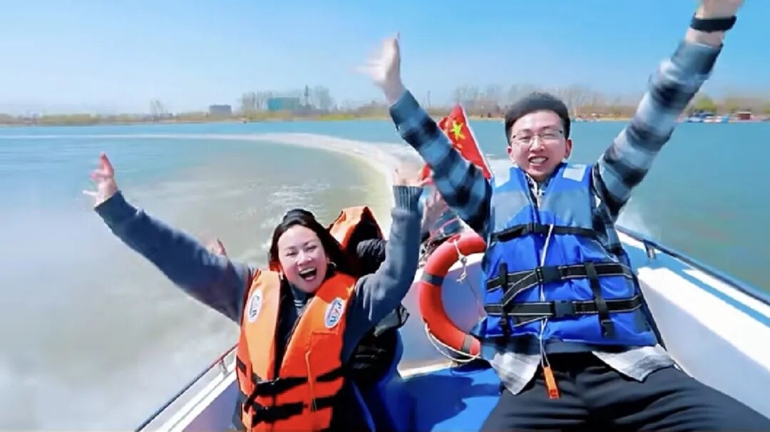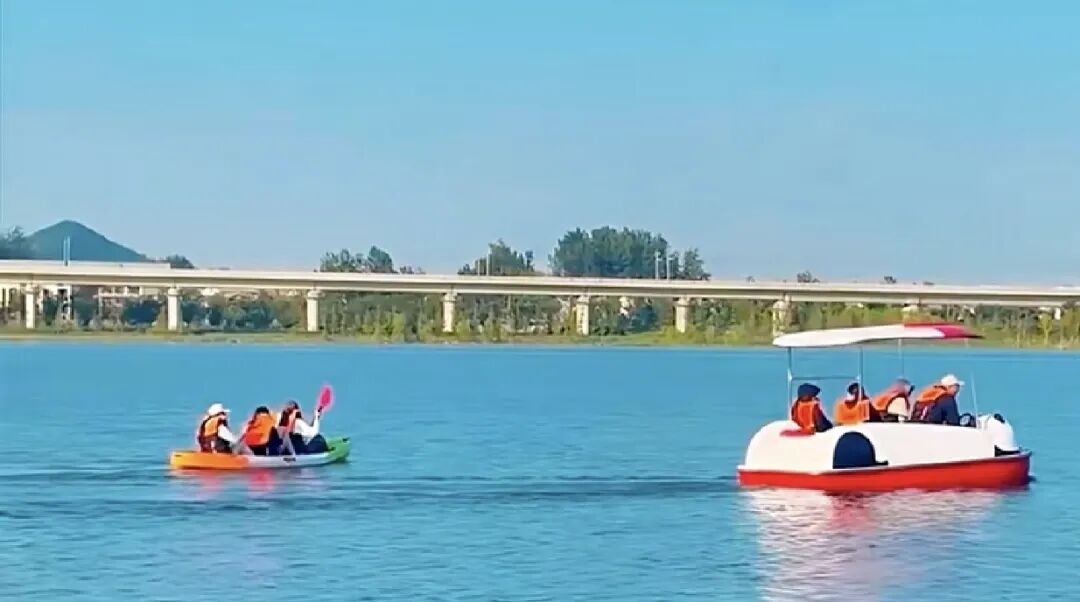 玉龙湖景区则如一幅铺展的山水画卷。游客或驾驶摩托艇破浪前行,或身着汉服乘船穿行于荷塘碧波,在古典诗意中感受假日的惬意,景区内游人络绎。