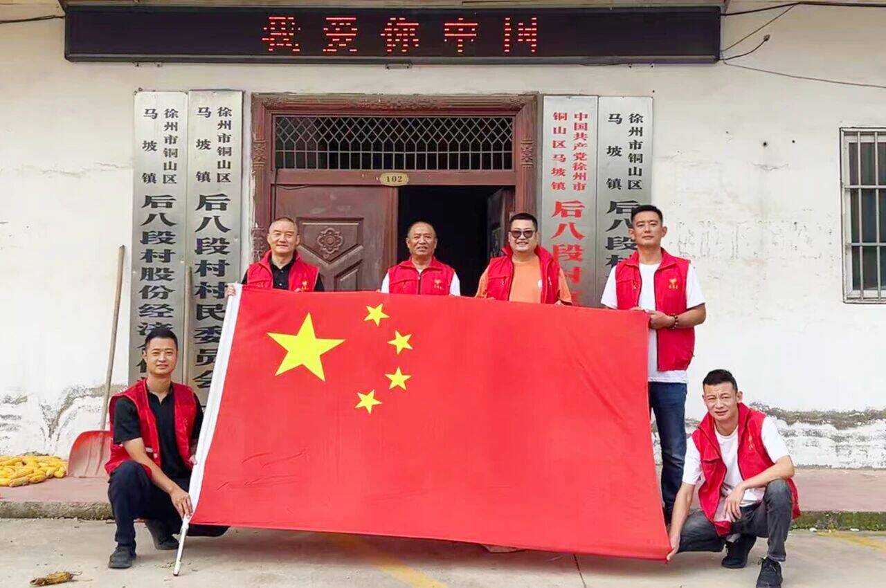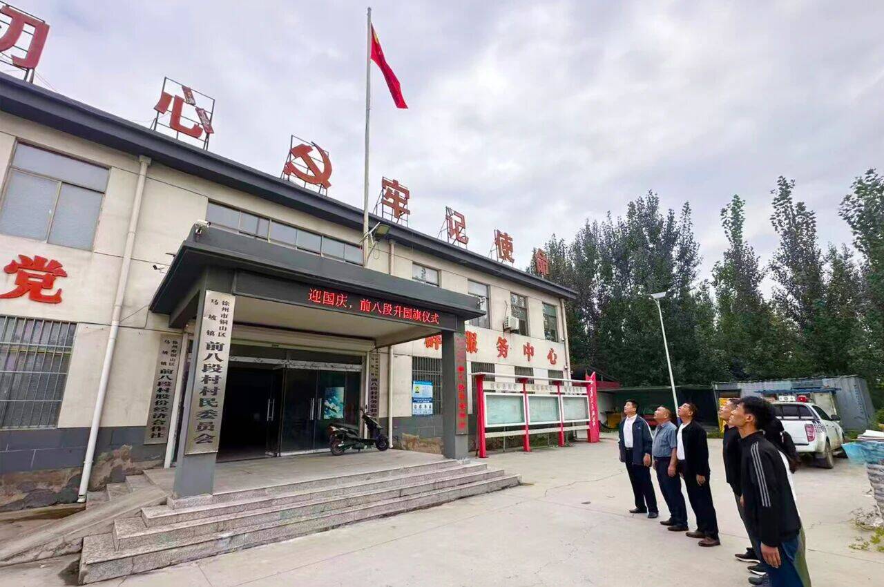 鲜艳的五星红旗,伴随着雄壮的《义勇军进行曲》冉冉升起。前八段村的党员干部整齐列队,脱帽肃立、行注目礼,目光紧紧追随着飘扬的国旗,齐声高唱国歌。激昂的旋律里,每一句歌词都满含对祖国的崇敬与热爱。