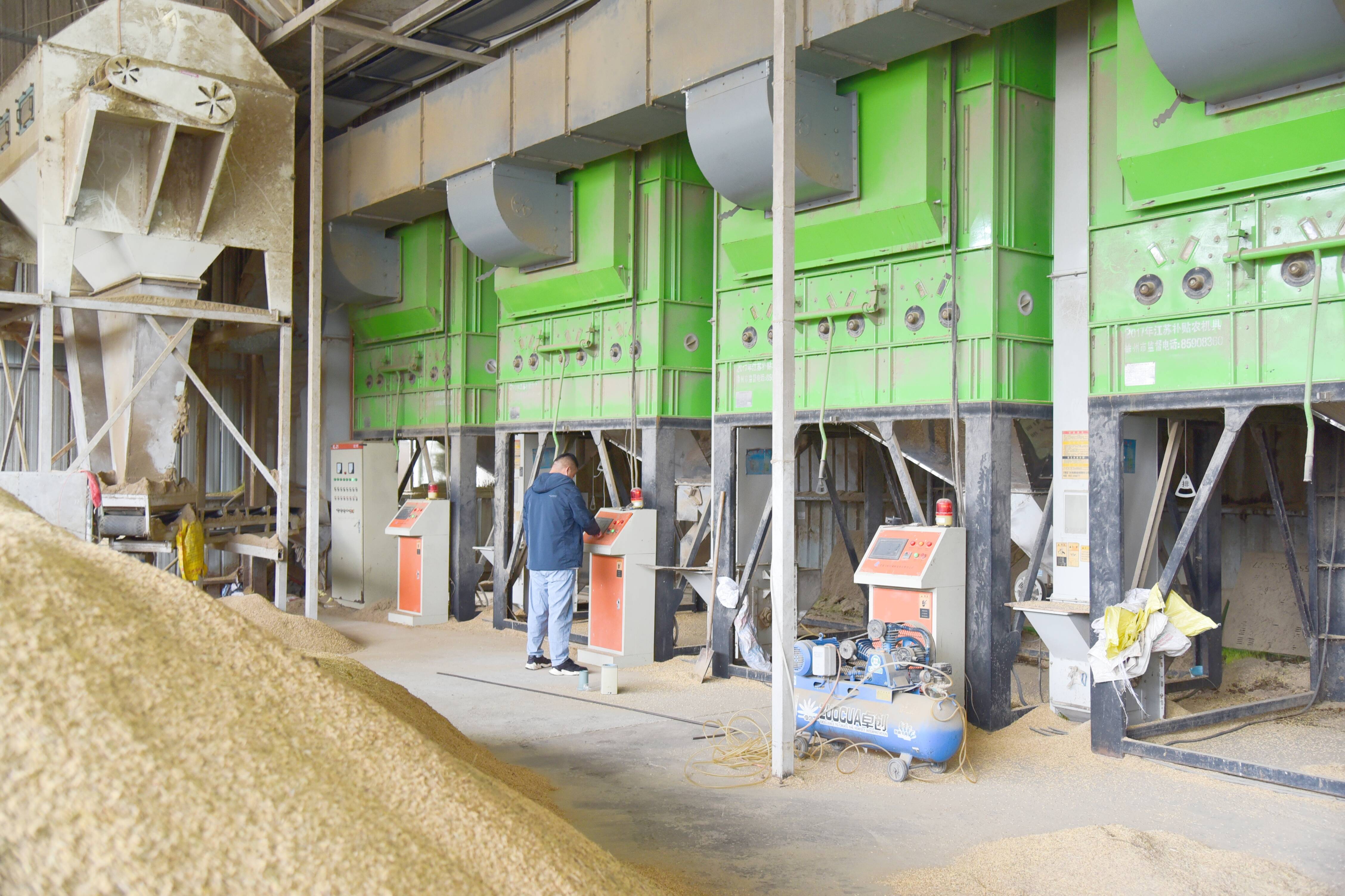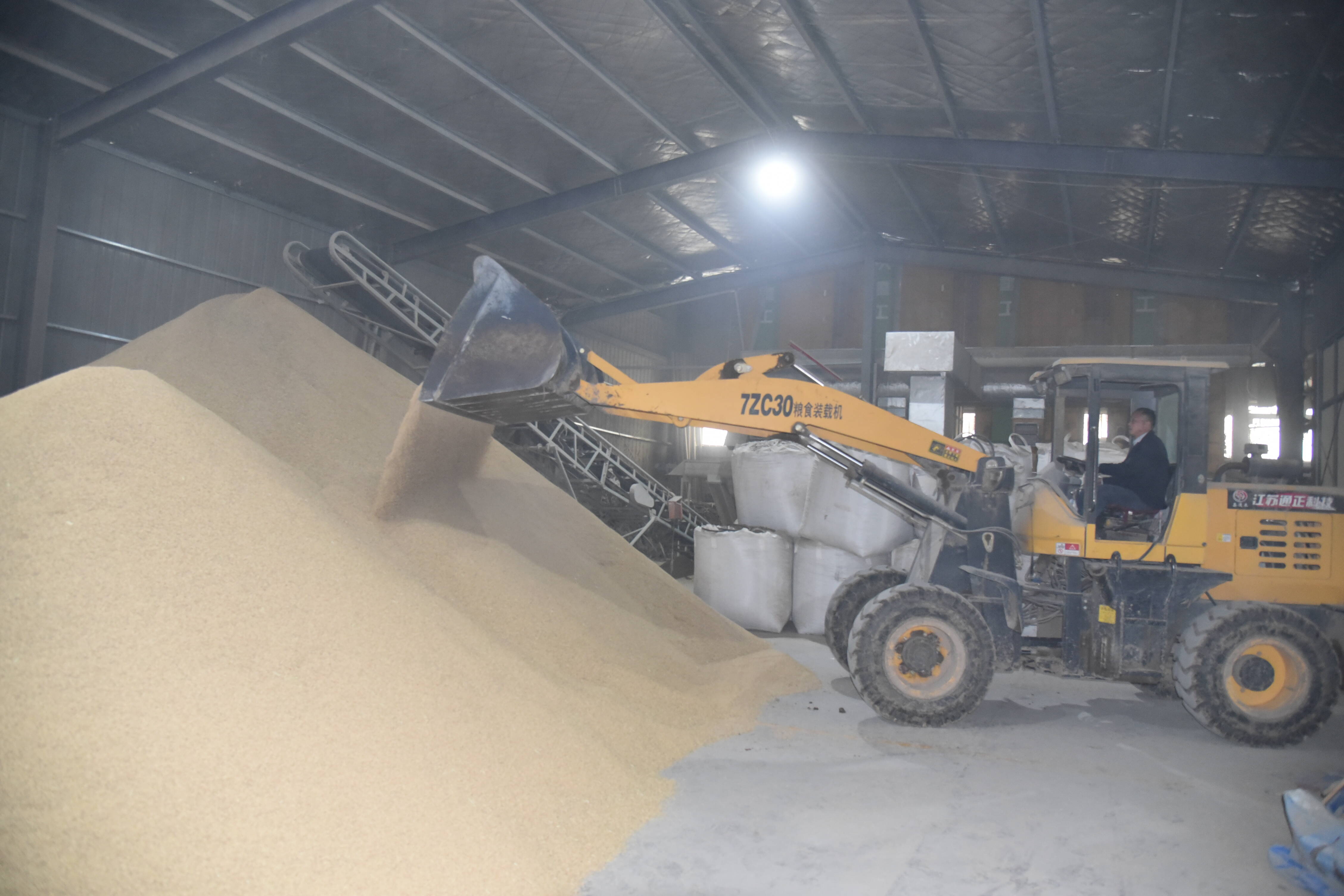 在铜山区房村镇马家村跃腾谷物种植专业合作社,4组智能化低温循环式烘干机正在对刚收割的稻粒进行烘干。只见湿黄的稻谷堆成一座座“小山”,机器的轰鸣声响彻整个厂房,工人正用铲车将稻谷倒进进料口,随后送到全自动粮食烘干线上,车间内“谷”香四溢。