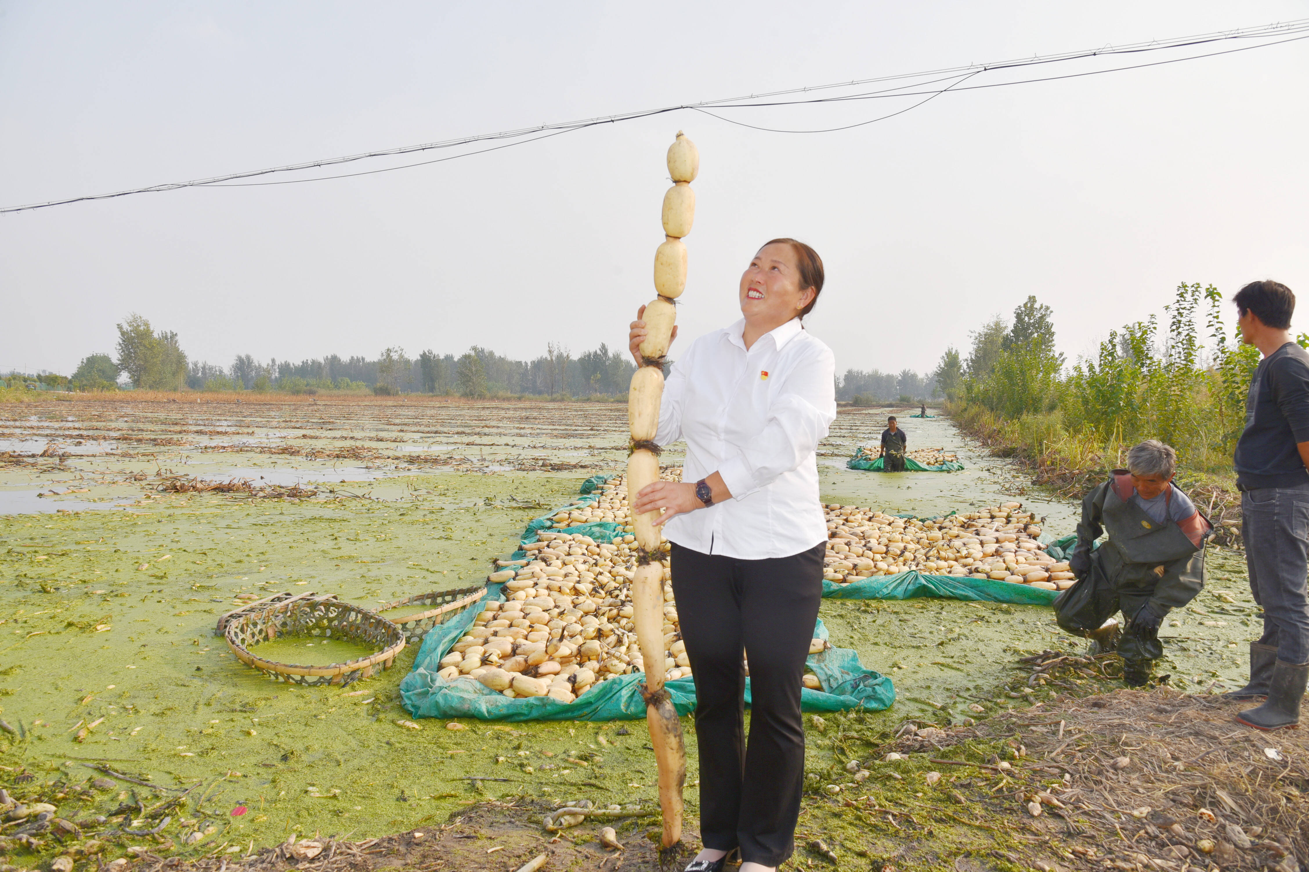 近年来,为改善运料河水质,房村镇党委政府加大治理力度,分类制定整治措施、整治标准,有效阻断了污染源头,将整治过的河道纳入常态化管理,打造了优质水环境。八王村抓住紧靠运料河的优势,于2022年1月份流转了运料河两侧560亩土地发展优质莲藕。为方便管理和销售,成立了徐州市铜山区霞书安谷物种植专业合作社,由村党支部牵头,推动小田入股、合作经营、利益共享,进一步发展壮大新型村级集体经济。“看,这藕带劲不,比我还高!”李桂侠举着一根白白嫩嫩的莲藕,喜笑颜开地说道。 “八王村的莲藕口感清脆微甜,深受大家喜爱,一斤能卖到3块钱,只要他们一出藕,我就来拉,国庆、中秋期间销售更火。”正在装车的商贩张玉发说。