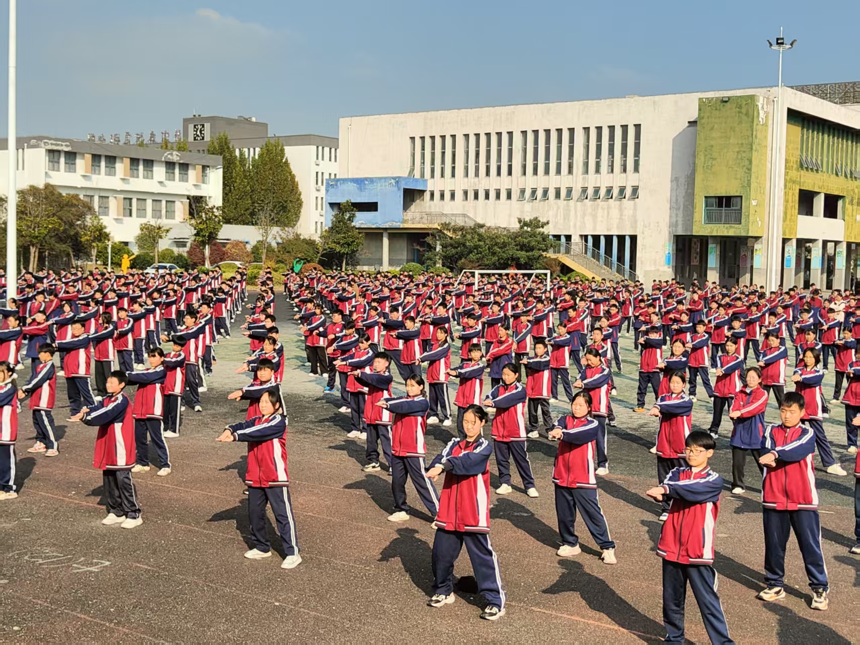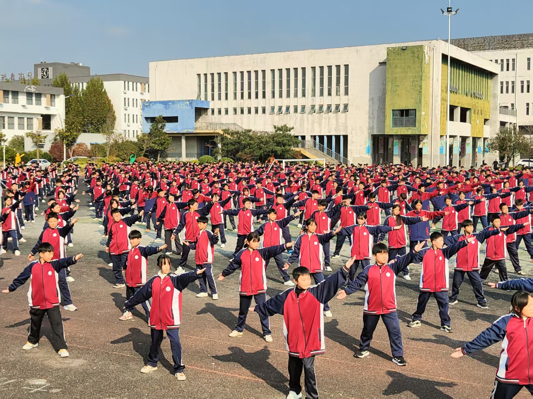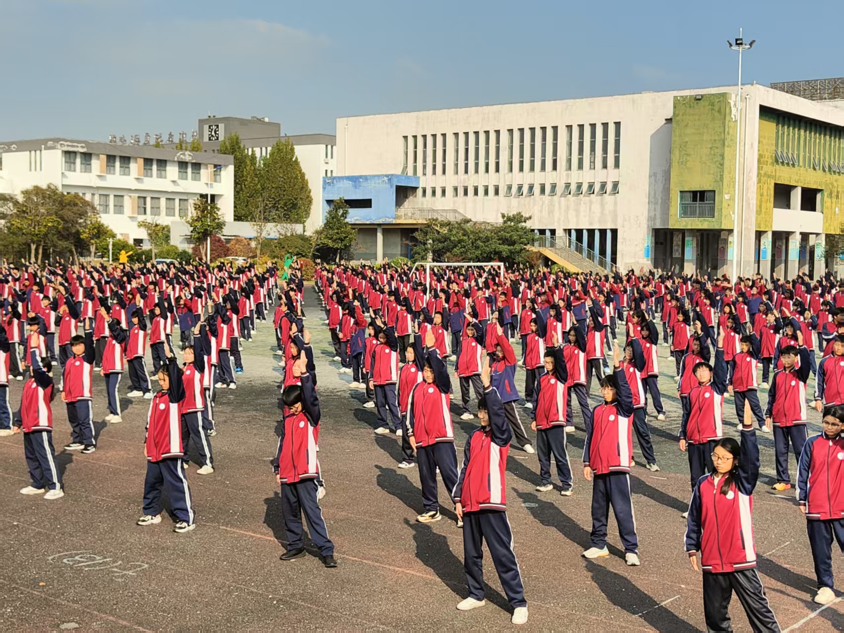 伴随着耳熟能详的旋律,同学们身姿挺拔、队列整齐,抬手如林、踢腿如风。伸展、扩胸、弯腰、转体,每一个动作都精准到位、舒展规范,既展现了广播体操的严谨韵律,又透着少年人特有的澄澈朝气,仿佛春日里拔节生长的新苗,尽显蓬勃向上的精神面貌。