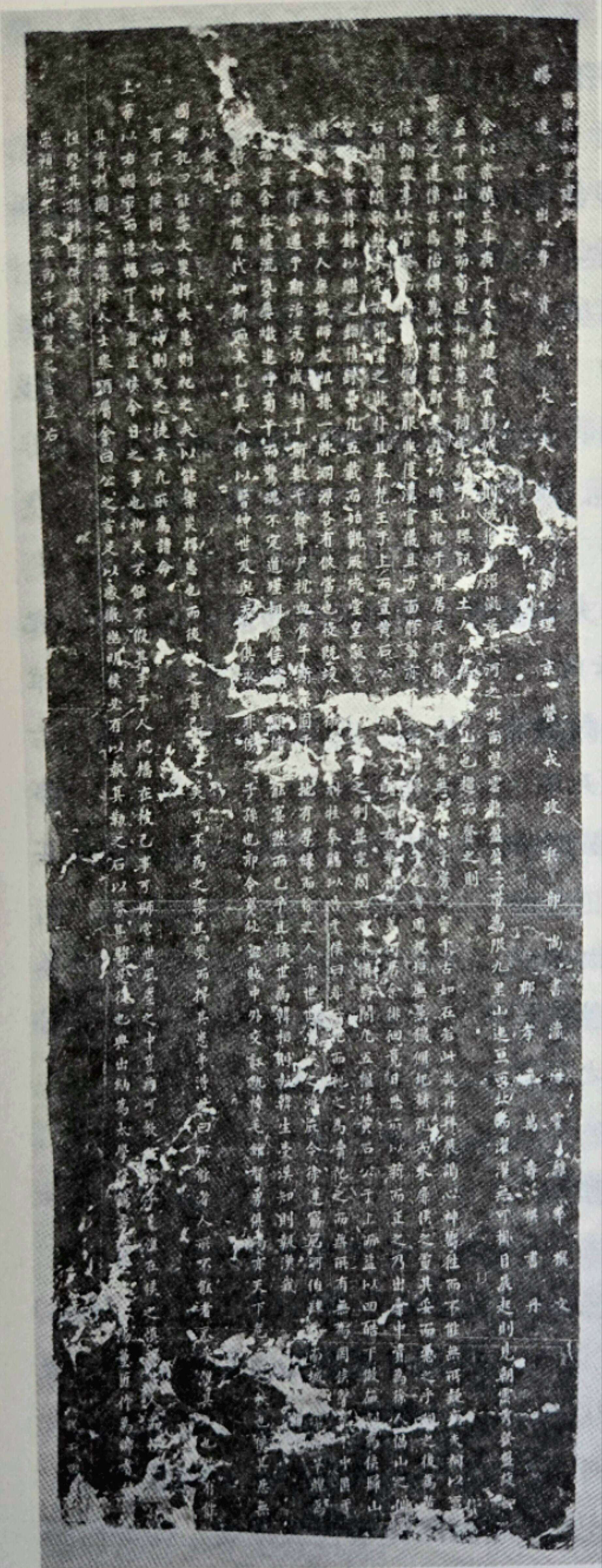或许是因为战争导致石碑损毁较为严重,拓片呈现多处剥落,原碑可能早已不存,拓片应为清代道光之前所拓。万先生的书画作品本就流传不多,碑文更是难得一见。碑文书法精美,大气磅礴,一气呵成,是难得一见的万寿祺早年的楷书精品。况且拓片面积之大(长1.9米,宽70厘米),字数之多(20行,866字),更可宝贵。