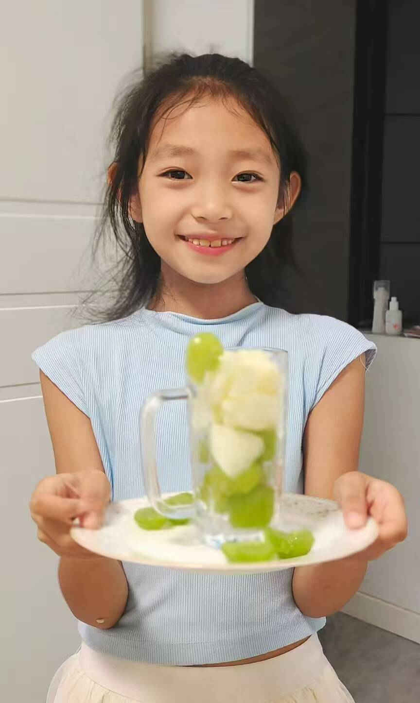 “妈妈请用茶——”我推开门时,妈妈正在看书。她先是一愣,然后眼睛弯成了最温柔的月亮。她咬了一口梨小船,又尝了一颗葡萄花蕊,她吃了一颗又一颗,说这是她吃过最甜的葡萄。其实我知道,有的葡萄明明有点酸,因为妈妈的眉毛悄悄皱了一下,可是嘴角却一直弯弯的,像月牙。最后妈妈把我抱在怀里,原来爱的味道,就是葡萄味的下午茶呀!