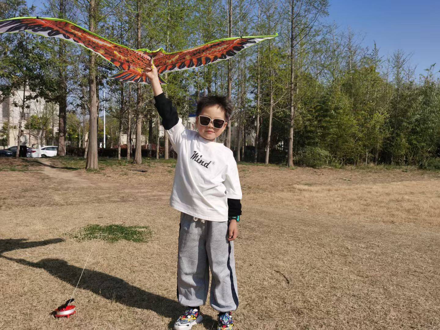 第二次,我们等风大一点再跑。风筝这次听话多了,它越飞越高,线轴在爸爸手里呼呼地转。我急得跳起来:“让我来!让我来!”