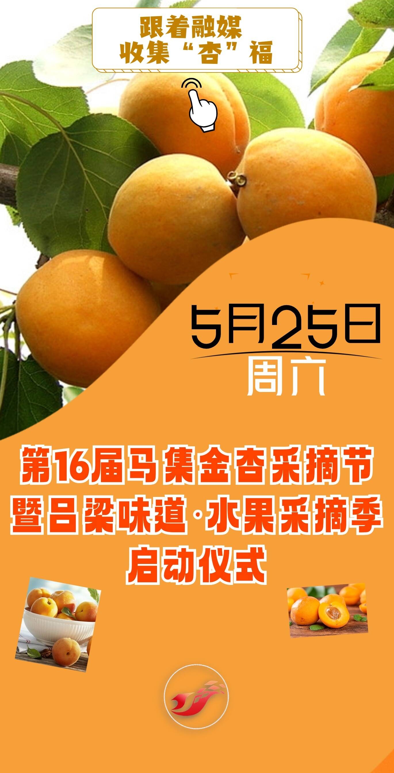 5月25日(周六)早上8:00,在铜山融媒体中心南门集合出发,免费大巴车带您一起去铜山区伊庄镇马集村(徐州吕梁十里杏花村)参加“第16届马集金杏采摘节暨吕梁味道·水果采摘季启动仪式”。