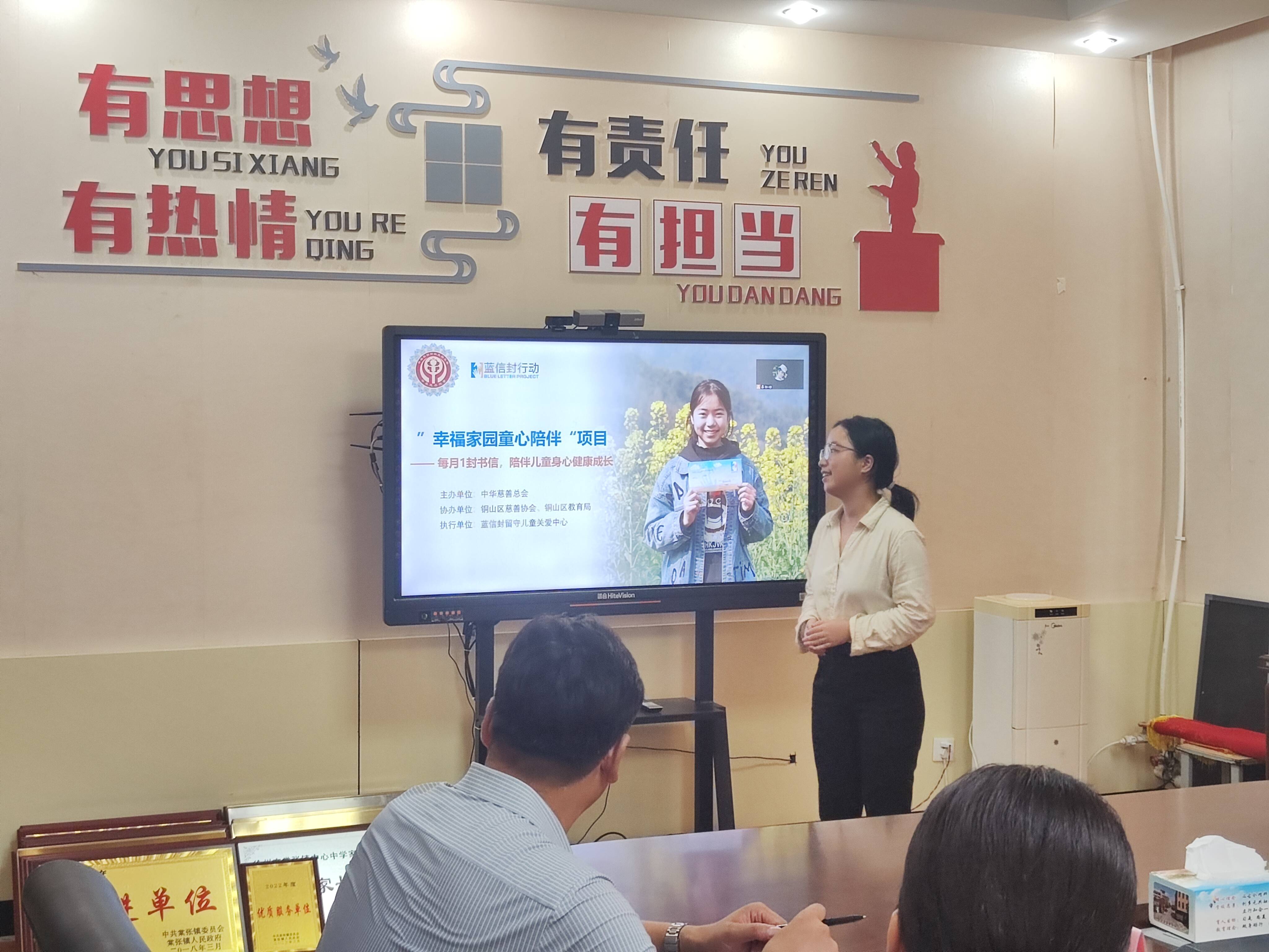 会前,项目组相关人员与棠张镇中心中学学生进行深度访谈、互动交流,着重了解青少年心理健康需求。会上,区教育局资助中心主任主持会议,区教育局副局长、区慈善总会副会长致辞,童心陪伴项目组相关人员通过线上线下的方式,为大家进行项目培训。