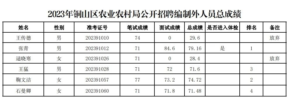 根据《2023年铜山区农业农村局公开招聘编制外工作人员公告》要求,现将总成绩予以公布(见附件),体检事宜由招聘单位电话通知,请考生保持电话畅通。