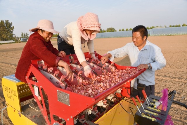 在八王村运料河旁的一块农田里,一台大蒜播种机正在作业。只见一人掌握着方向、两人坐在播种机上查看槽位,如有空缺迅速补上蒜瓣,三个人配合默契。伴随着咔哒咔哒的机器声,一瓣瓣大蒜被栽进土壤里,在保证速度的同时,也保证了每个蒜芽朝上。