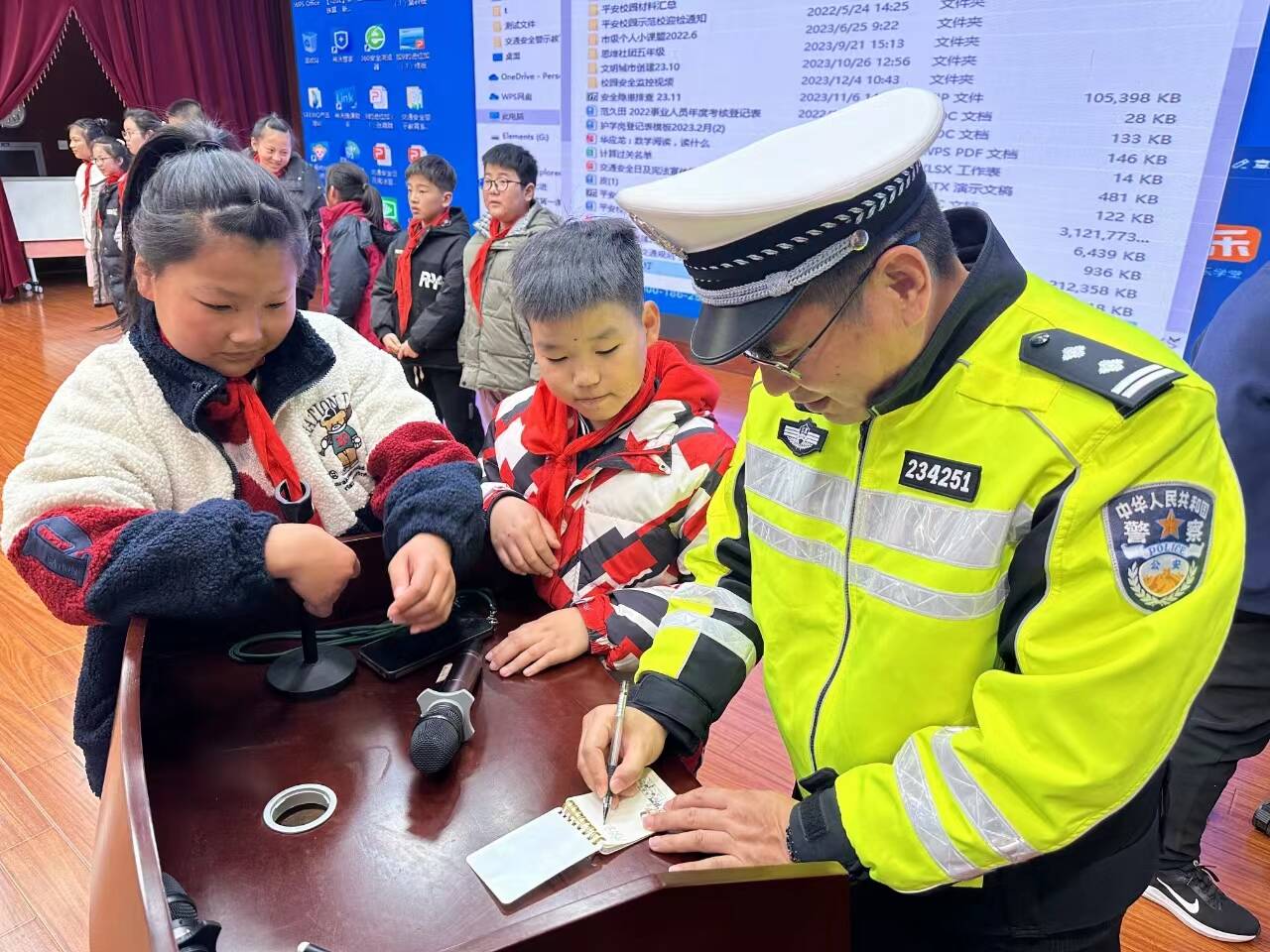 民警从“交通信号灯、交通标志、标线,如何安全乘车、文明走路”等方面,向学生生动讲解了交通安全常识以及自我防护技能,让孩子们真正学到“知危险”“会避险”,在寓教于乐中播撒了交通安全的种子,丰富了孩子们的交通安全课程内容,同时也提高了孩子们的自我保护意识和交通安全意识。