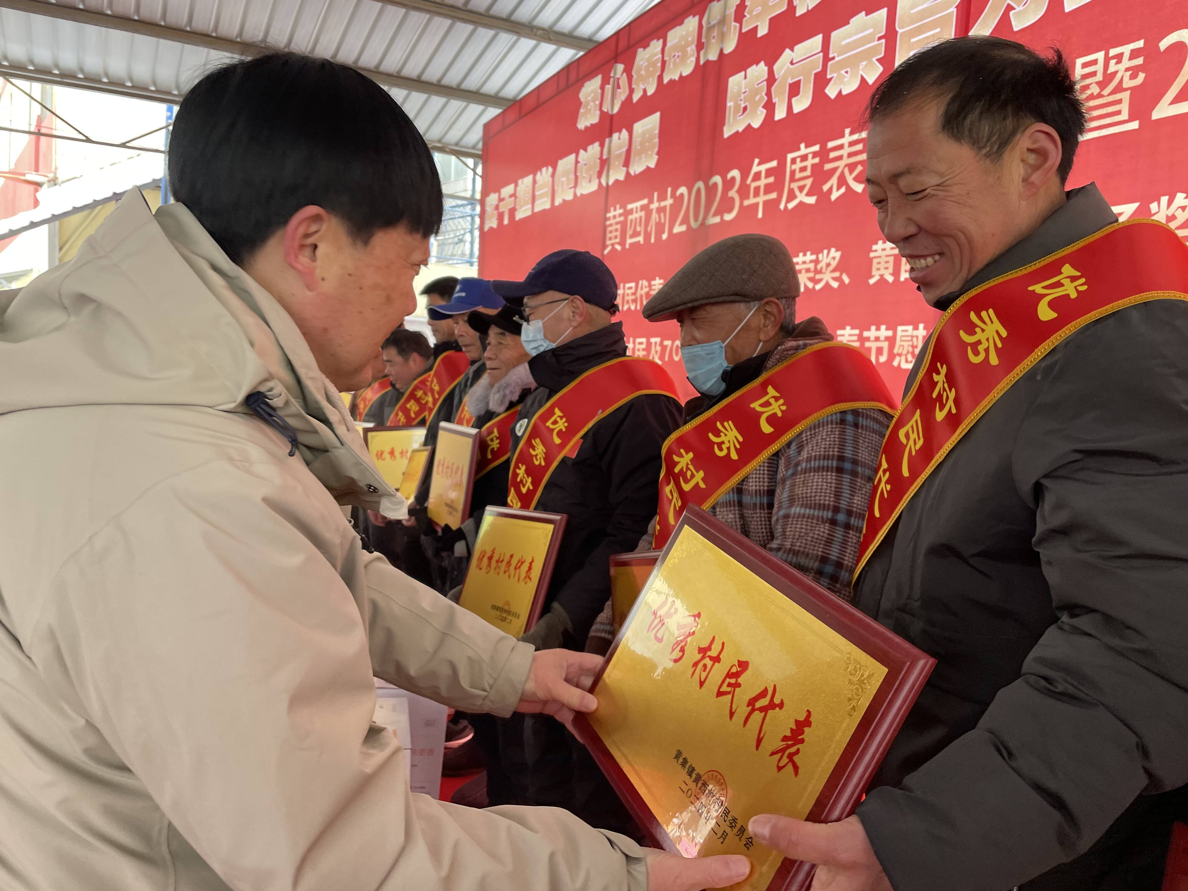 连续第6年了,每年春节前一星期,都是黄西村最热闹的日子,全体村民欢聚一堂,以“股东”身份参加村集体经济分红,共享村集体经济发展带来的红利。此外,村里又拿出60万元,为六十岁以上老年人发放米、面、油、奶、肉等春节慰问品;为七十岁以上孤寡老人发放每人500元慰问金;为因大病造成经济困难的家庭发放救助金2000-5000元;对村里涌现出来的优秀共产党员、优秀村民、好婆婆、好儿媳、劳动模范以及优秀学子等进行表彰奖励,并为90岁老人送寿糕。