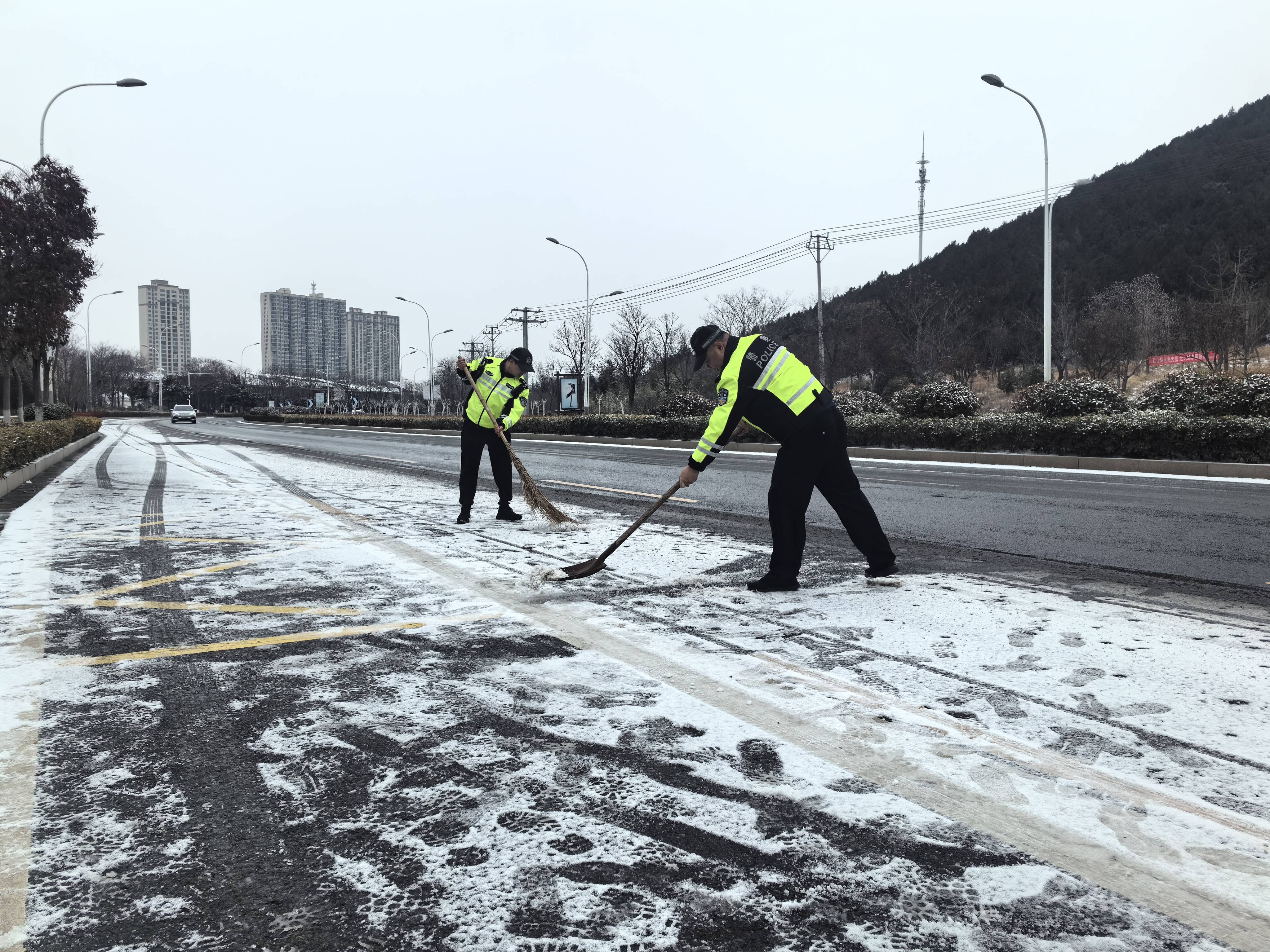在全力做好疏堵保畅工作的同时,铜山交警大队积极联合路政、养护等部门,加强协作,多策并举,加大融雪除冰工作力度。对长坡陡坡,桥梁涵洞等积雪结冰路段、急转弯等重点路段,主动出击,采取铲冰、抛洒融雪剂、及时救助受困车辆,确保道路交通安全、畅通!