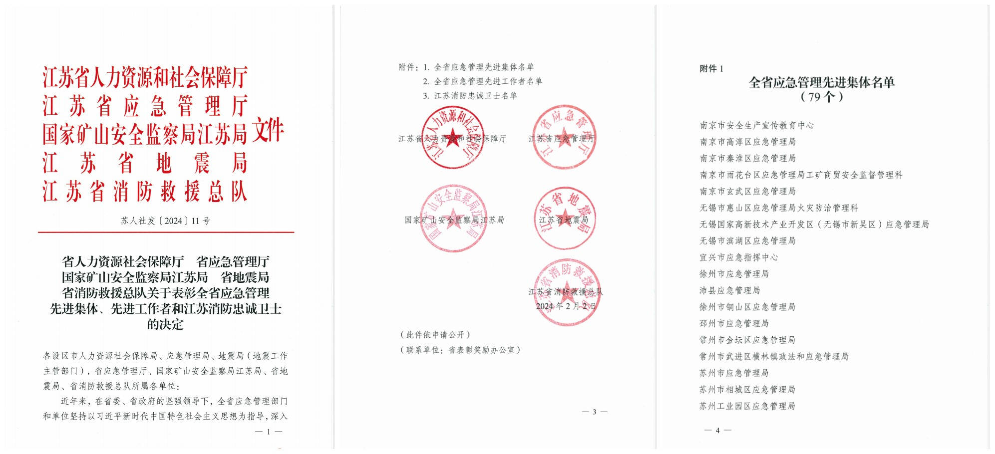 近日,铜山区应急管理局受到省人力资源和社会保障厅、省应急管理厅、国家矿山安全监察局、江苏局省地震局、省消防救援总队表彰,荣获“全省应急管理系统先进集体”荣誉称号。