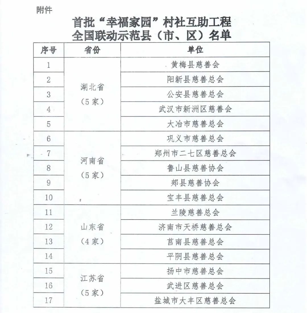 4月29日,中华慈善总会公布了首批“幸福家园”村社互助工程全国联动示范县(市、区)名单,徐州市铜山区位列其中。获此殊荣的30个县(市、区)中,江苏5家、徐州1家。