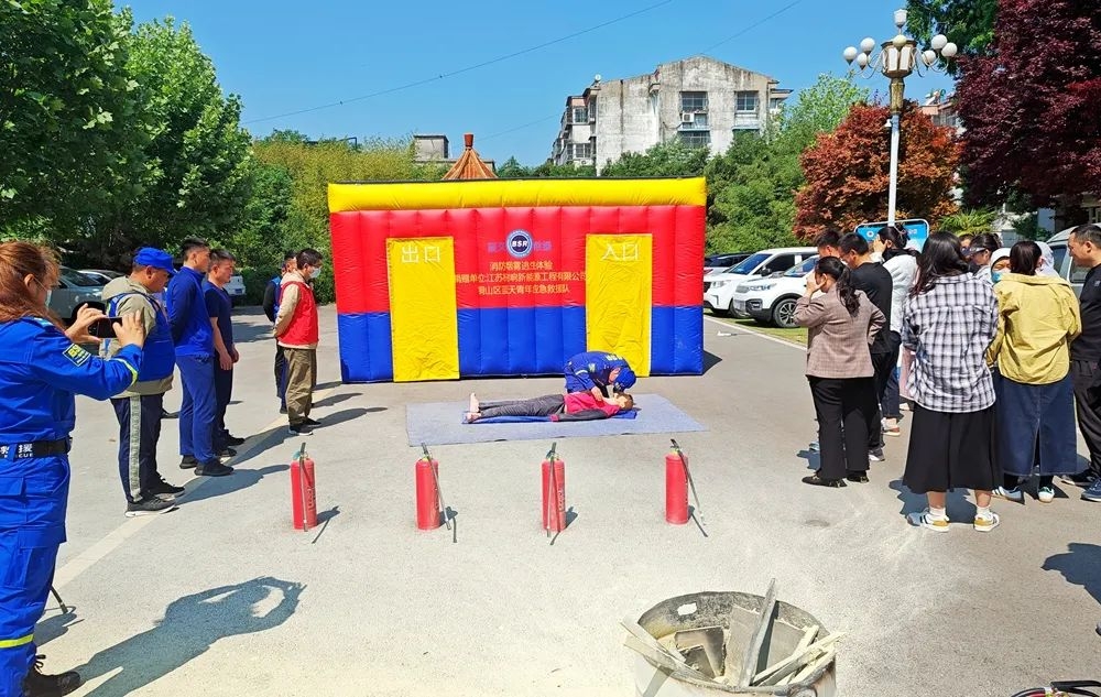 在防灾减灾演练活动现场,铜山区蓝天青年应急救援队组织开展消防疏散逃生体验屋演练,让现场人员直观体验火灾逃生过程。应邀前来的铜山区大彭镇消防中队队员进行初期火灾扑灭,蓝天救援队队员组织现场心肺复苏、海姆立克腹部冲击法和包扎急救培训,现场人员纷纷轮流上阵亲身体验灭火实操和心肺复苏术。