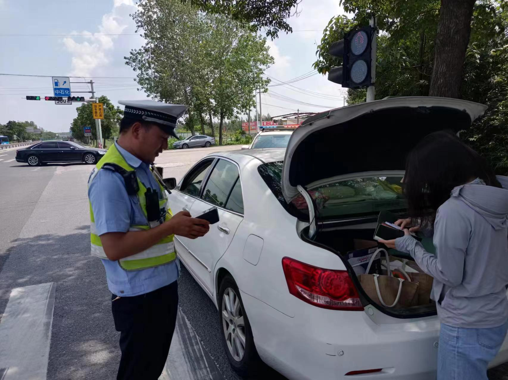 茅村中队中队长段海波,冒着高温在查处违法车辆
