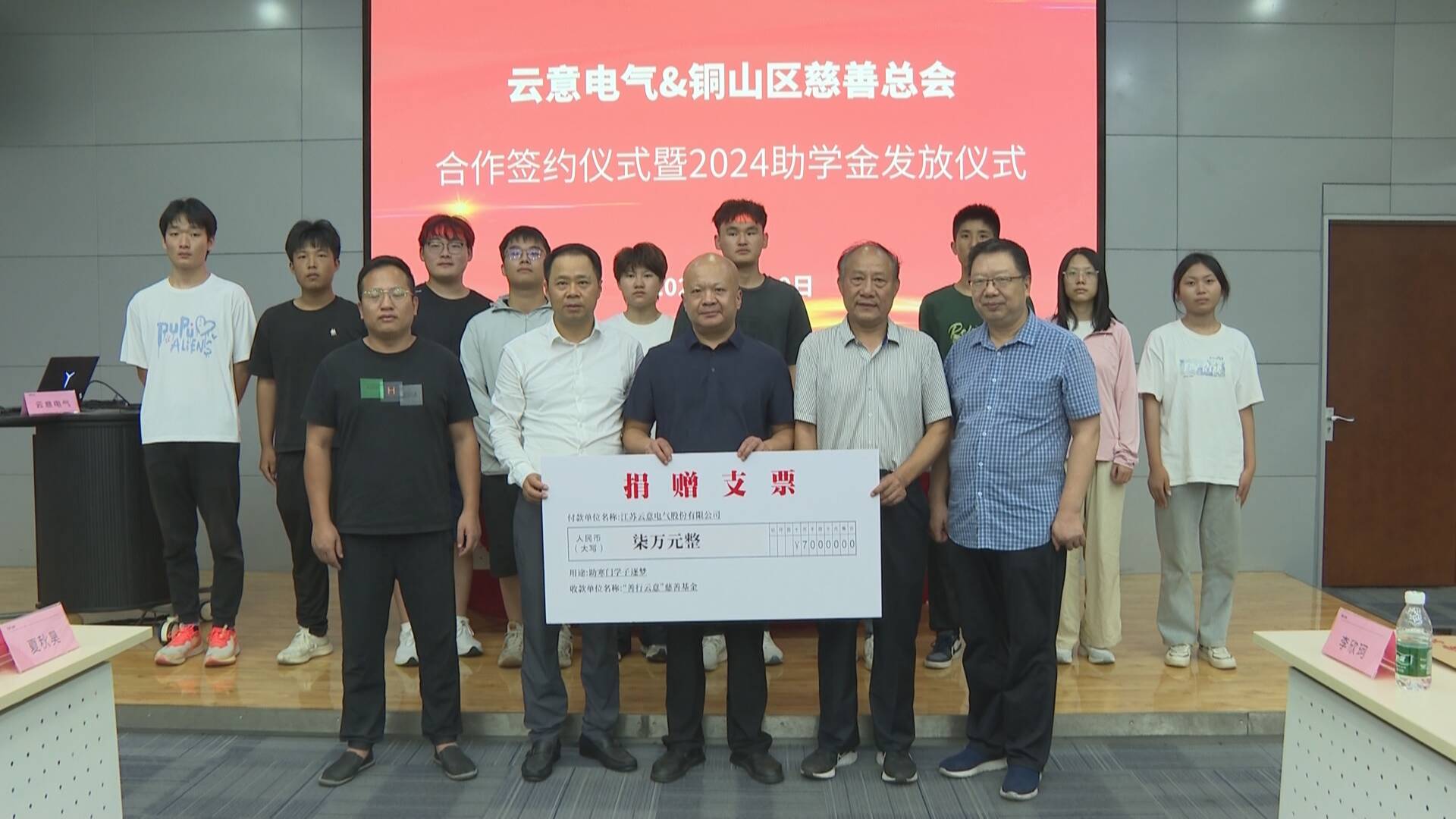 8月29日,云意电气、铜山区慈善会合作签约暨2024年助学金发放仪式举行,云意电气决定向铜山区慈善总会捐款设立“‘善行云意’慈善基金”,以弘扬乐善好施、扶危济困的传统美德。现场为铜山区考入大学的14名贫困学生提供每人5000元人民币的资助,希望能够减轻他们家庭的一部分负担,让他们能够更加专注于学业和个人成长。