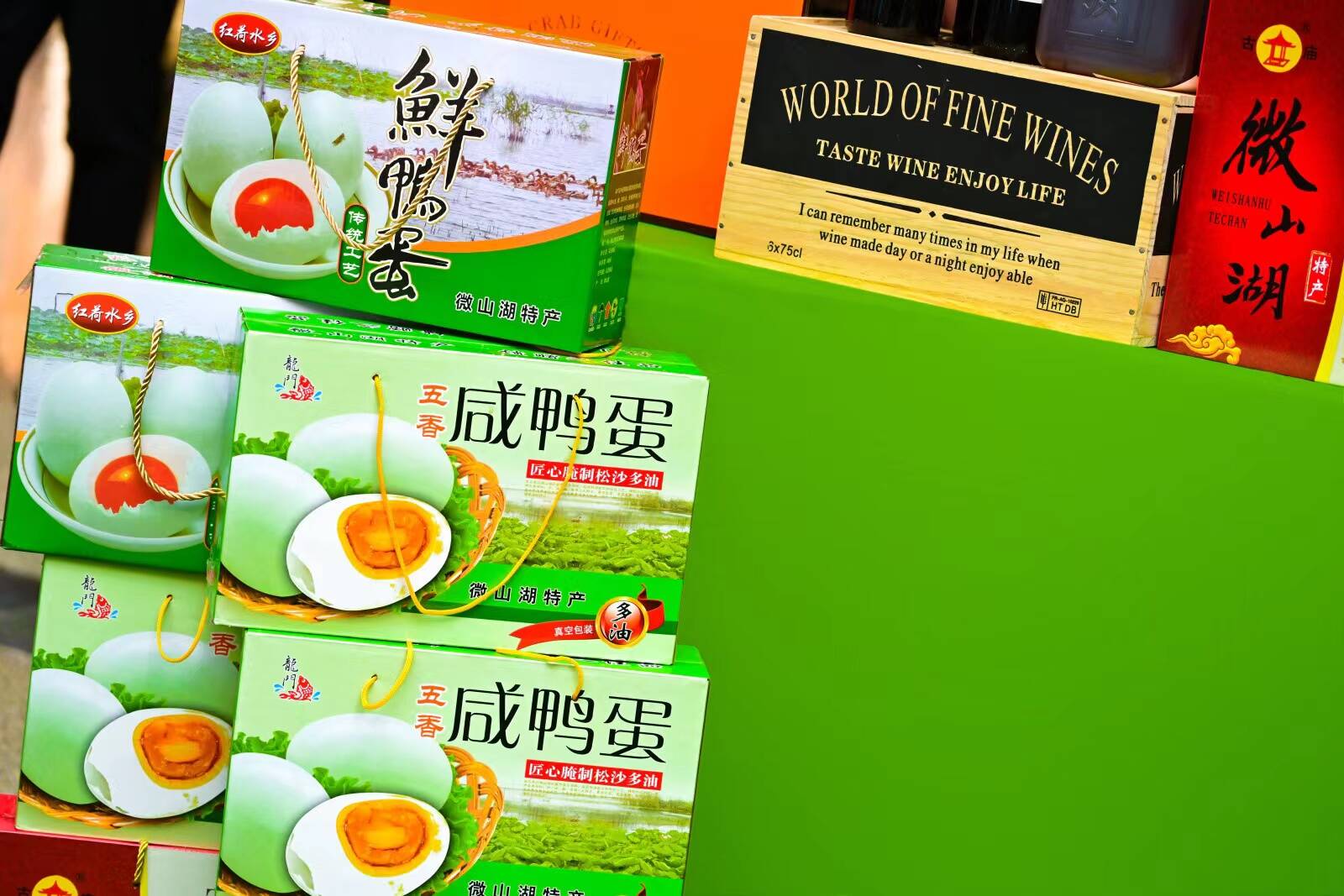 现场展陈以金秋露营为主题,配备时尚手举牌供游客拍照打卡,12个展销台分列两侧,各乡镇及北洞山汉墓的推介官带着各自的特色美食、非遗产品、乡土产品、文创手作等游购好物现场推荐,琳琅满目的商品吸引了众多游客与市民驻足品尝、体验、购买。
