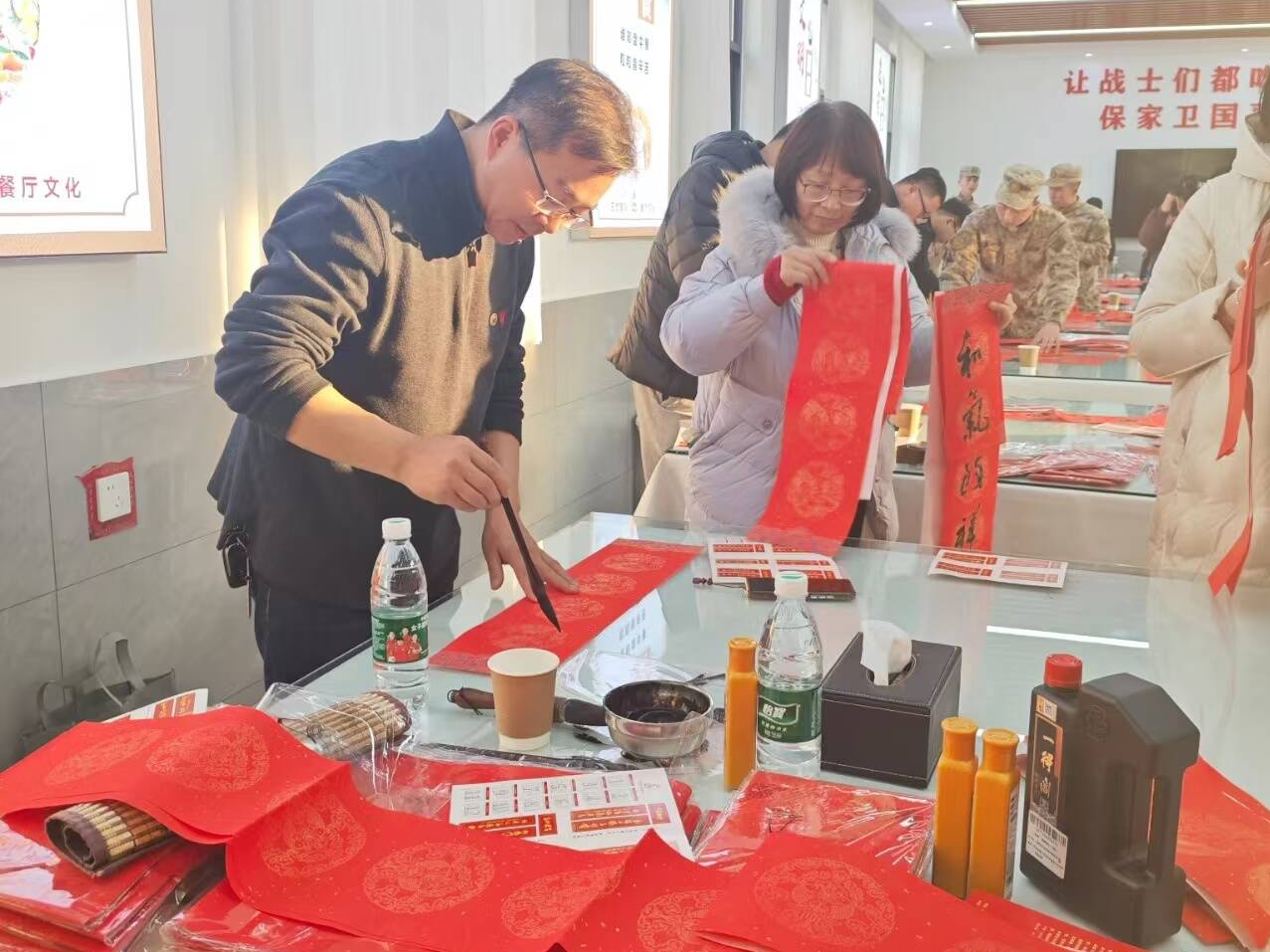 铜山新联会特意为军人军属准备了福袋,表达祝福!铜山新联会副会长、市爱国拥军文化促进会会员、市青年书协主席岳继承带领青年书法家夏小雷、李培、谢雨杭、付兴宇、高向志等参加活动大家为军人军属书写春联、福字300余幅。