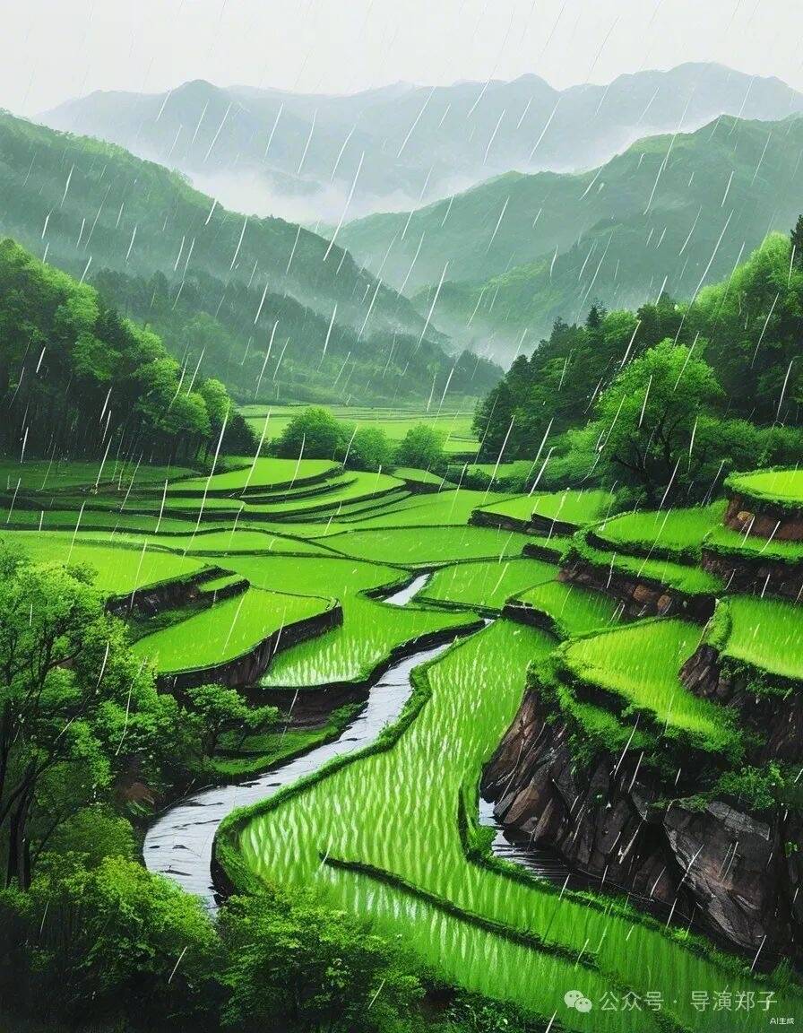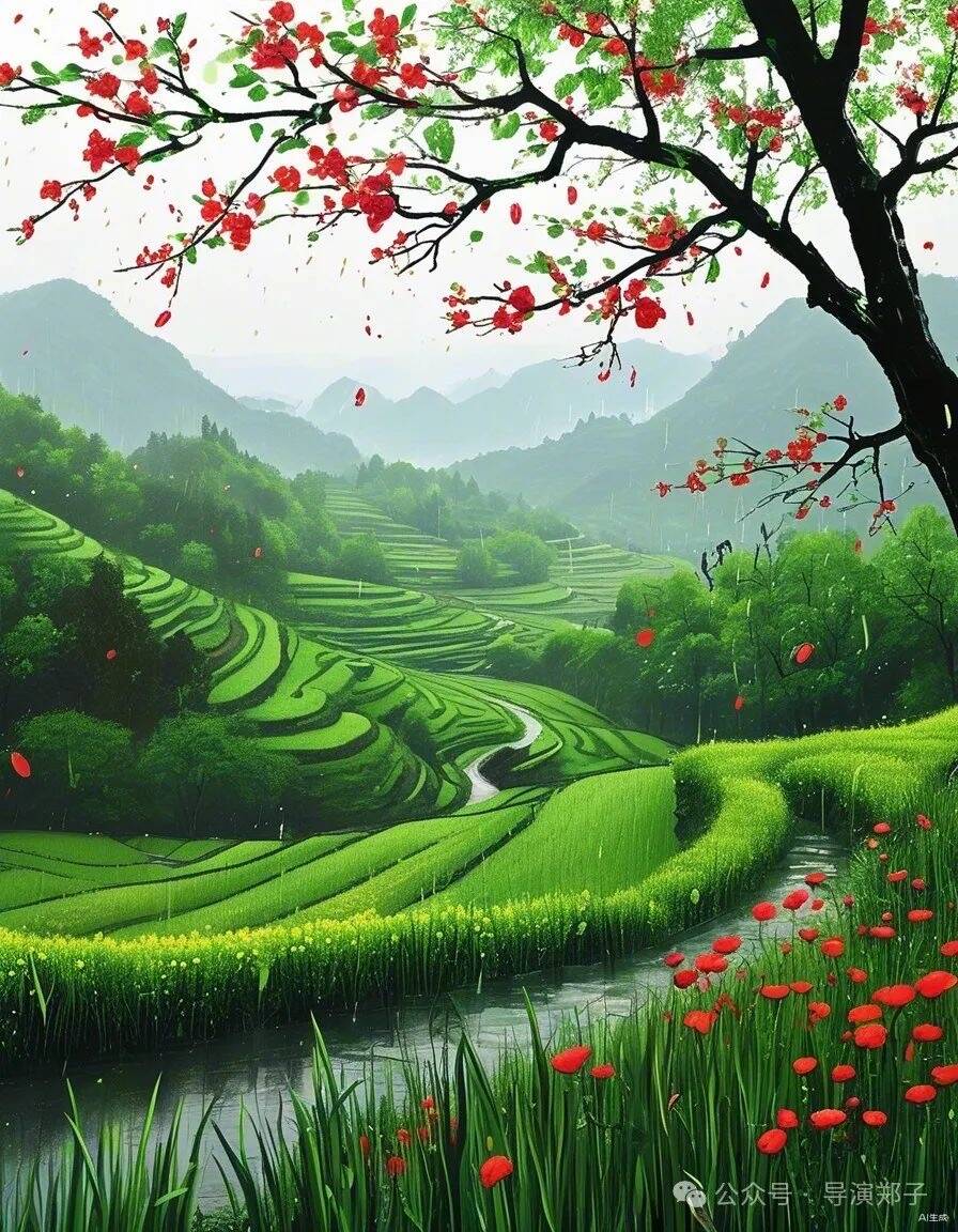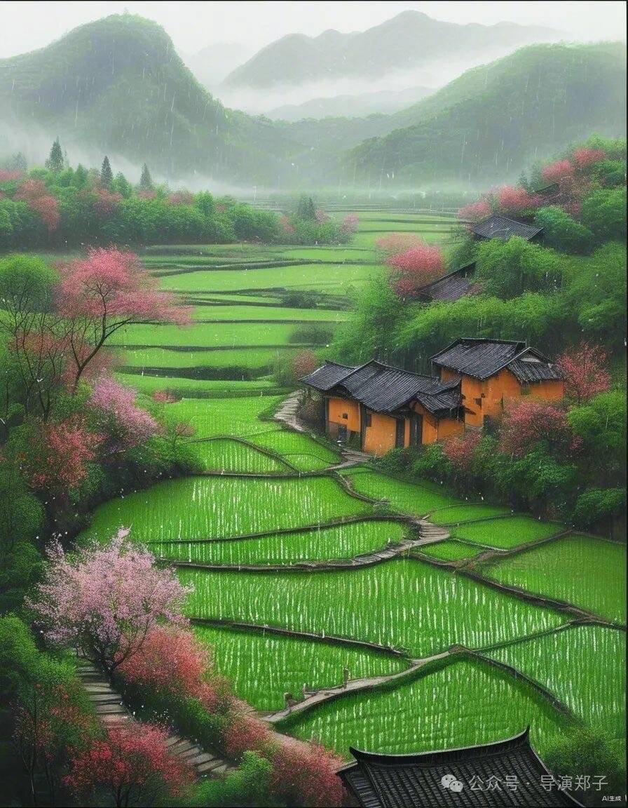 听谷雨,观花季,望俏羽。和风正暖,香茗扑鼻。白云彩霞落,春笋沐微笛。柳色空烟景象,峰下素野苍密。三候桑树冠胜祺,布谷播风曾留衣。