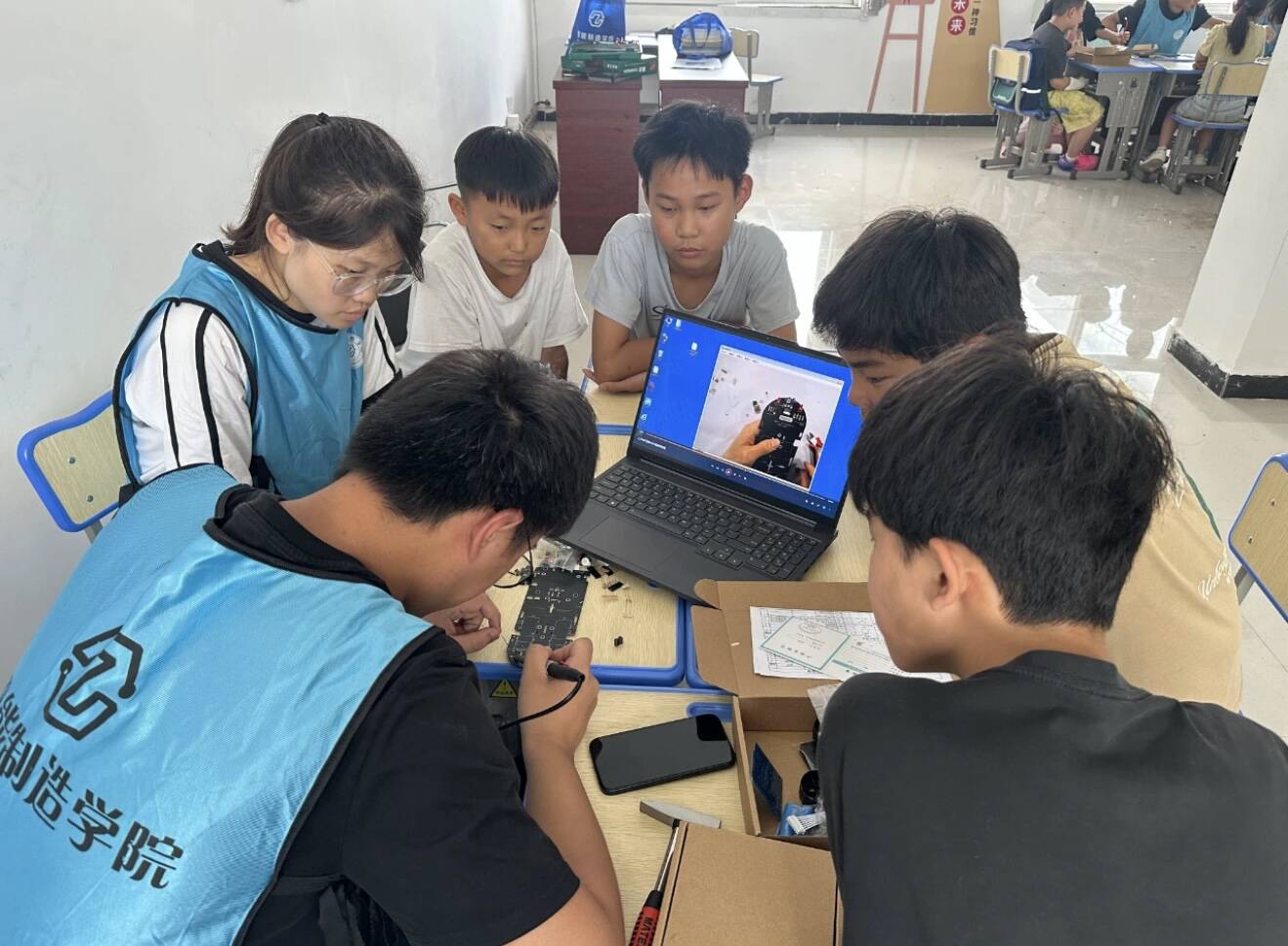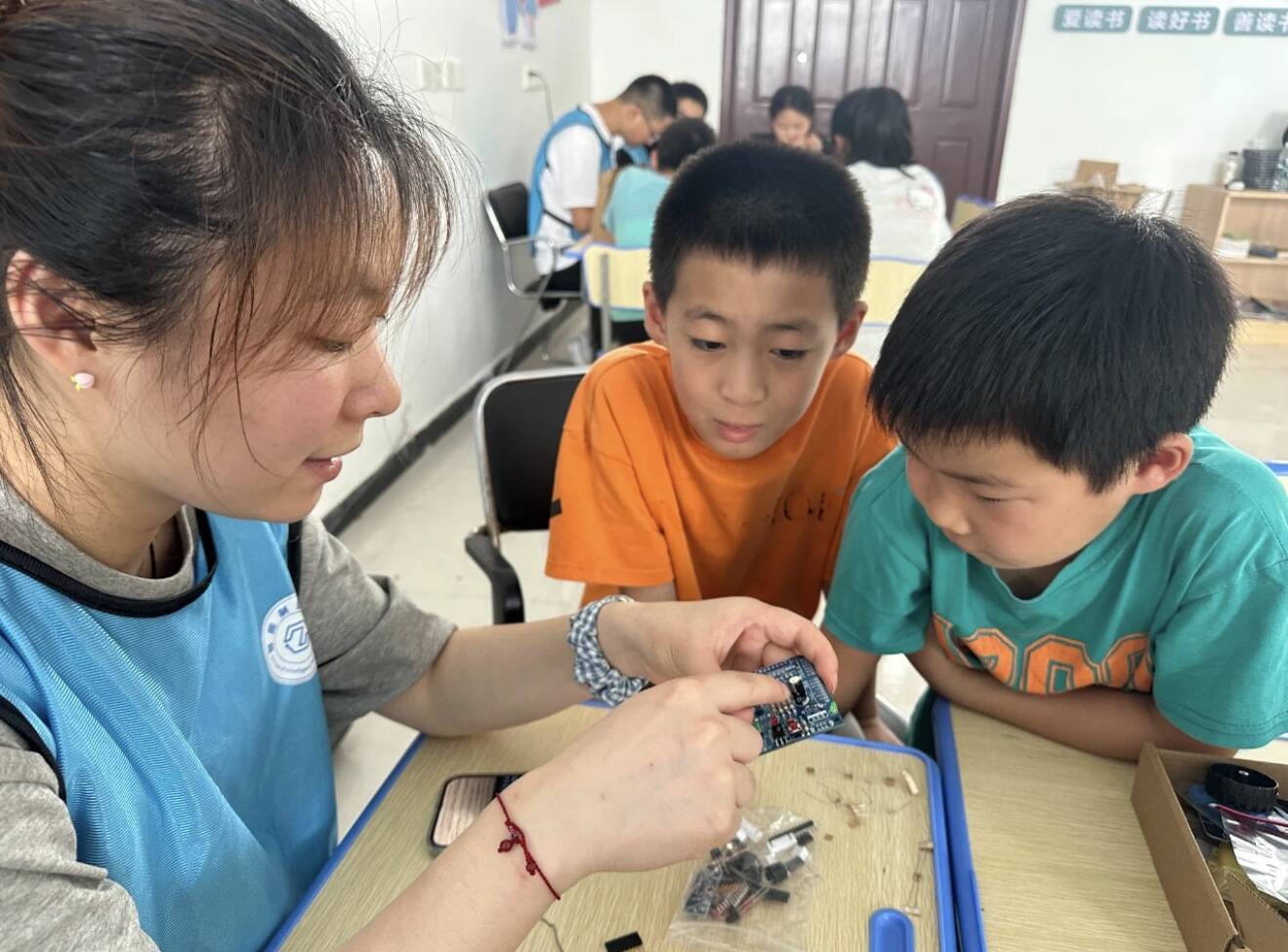 挂牌仪式后,大学生志愿者们化身“小老师”,为暑托班20名孩子带来了一场生动的科学实践课——动手制作电动玩具车。他们精心准备了材料包,从电路原理到零件组装,一边制作一边跟孩子们讲解相关原理。孩子们睁大好奇的眼睛,跟着“小老师”的节奏,一步步完成电路板焊接、线路连接、玩具车拼装。当第一辆自制玩具车跑起来时,教室里爆发出欢呼声,孩子们的脸上洋溢着自豪与喜悦。“原来科学这么有趣!”一名暑托班的孩子兴奋地说,眼中闪烁着对知识的向往。