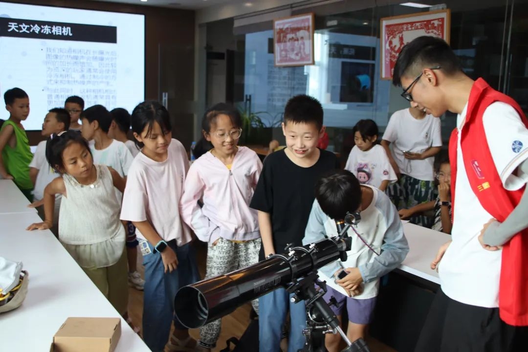 在志愿者的指导下,孩子们排着队,一个接一个地通过专业望远镜观察远处的景物。“老师,我看到对面楼顶的小鸟了!”“树叶的纹路好清楚啊!”虽然白天的观测条件有限,但这样的初体验已经在孩子们心中种下了探索宇宙的种子,激发他们探索未知的兴趣。