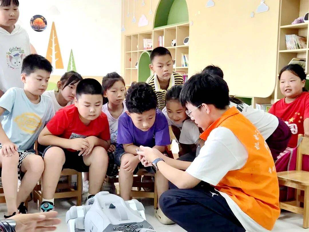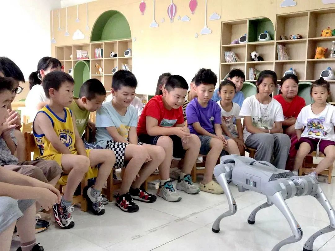 近日,新区街道麦楼社区爱心暑托班上演了一场趣味“人机互动”表演。教室里,孩子们围在机器狗周围,弯腰观察机器狗灵活摆尾,伸出小手轻轻触摸“手掌”,眼中满是好奇与兴奋。