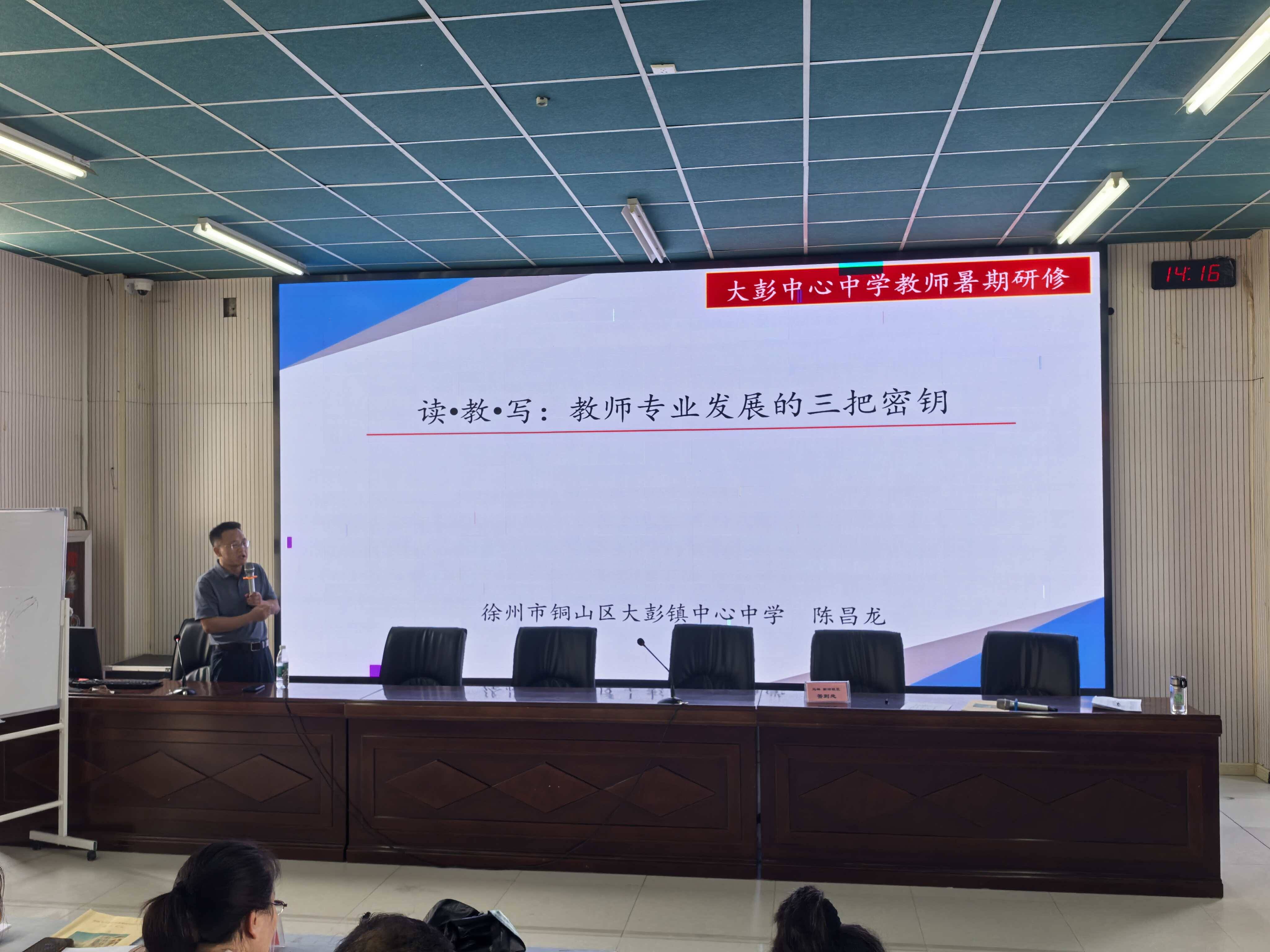 培训第三项由大彭中学副校长陈昌龙作题为《读·教·写:教师专业发展的三把秘钥》的报告,他说:“在我的专业发展道路上,对我影响最大的就是书籍。从开始阅读专业书到博览群书,再到阅读自己研究领域的书,从一个人阅读到带领团队一起读,从一节节好课的产生到教育教学文章、教育专著的发表……我在与书结缘中一次次成长。”