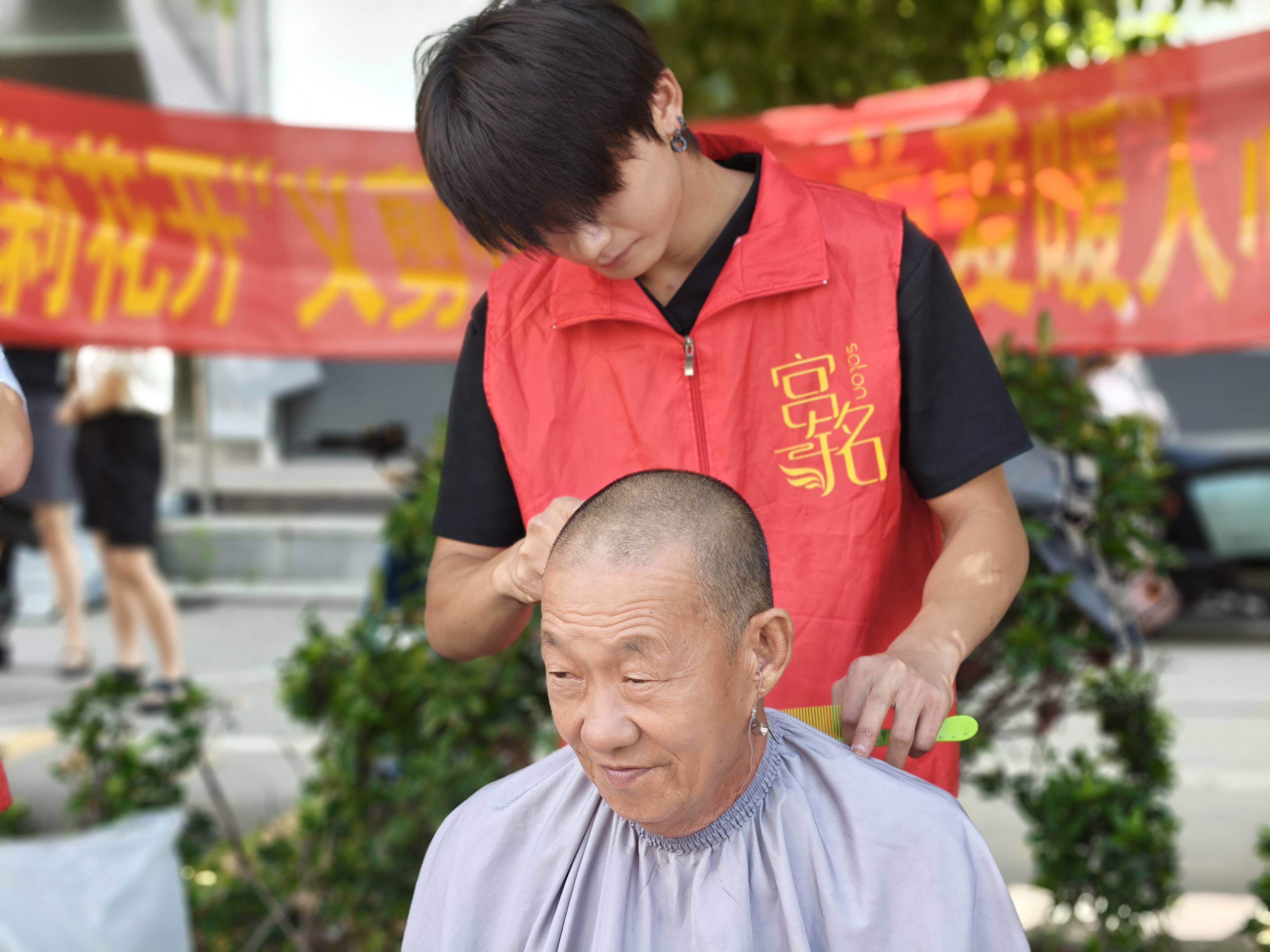 闻讯而来的居民们络绎不绝,大家在志愿者的引导下有序排队等候。下午志愿者们走进柳泉镇养老院,为行动不便的老人们提供上门服务。发型师志愿者们耐心询问每一位服务对象对发型的要求,一边精心修剪,一边亲切唠家常。剪刀开合间,发丝飘落,原本有些凌乱的头发变得整齐利落,村民们的精神面貌也随之焕然一新。年过七旬的张奶奶摸着新剪的短发,乐得合不拢嘴:“这发型真精神!这些小伙手艺好,心肠也好,真是想到我们心坎里去了。”