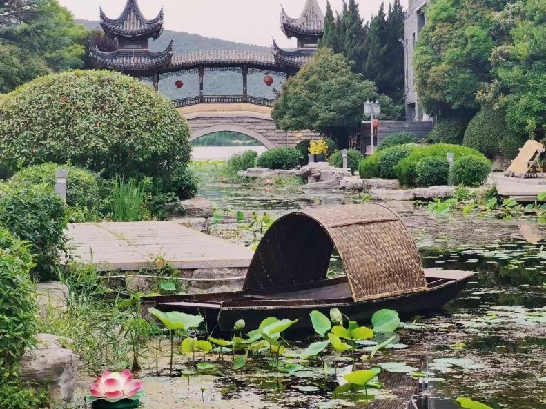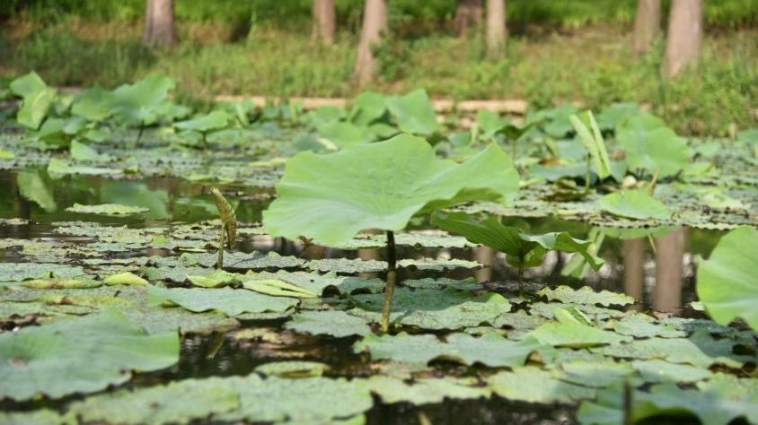 池塘旁边的青翠树木为这片绿色世界增添了一抹生机。树叶沙沙作响,微风穿过树梢,带来了一丝丝凉爽。偶尔有小鱼跃出水面,激起一圈圈涟漪,打破了宁静的氛围,却也为这个夏日的画卷增添了一份活力。
