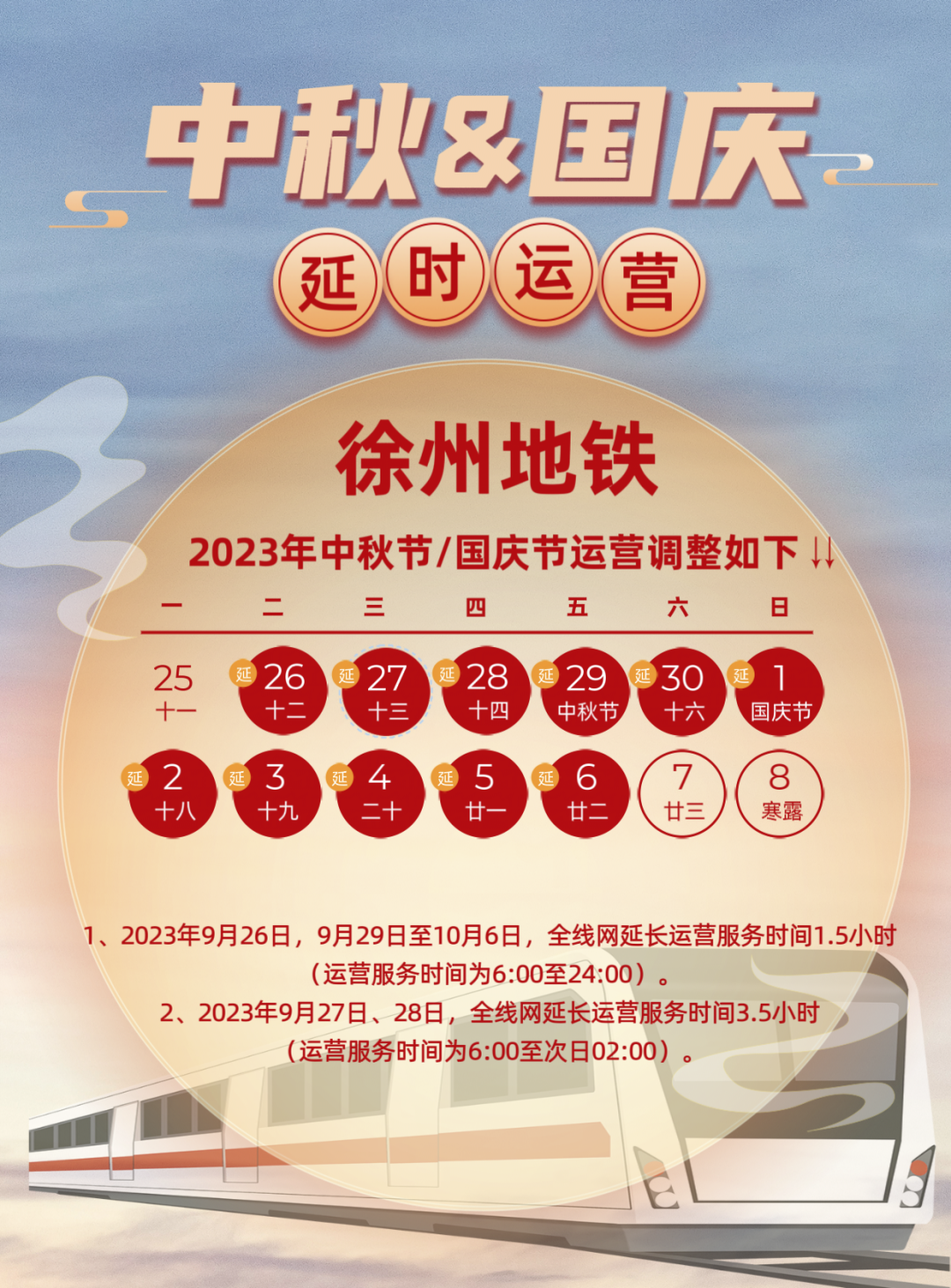 2023年中秋、国庆假期即将来临,为畅通城市交通,保障市民节假日期间出行,徐州地铁将延长运营服务时间,具体如下: