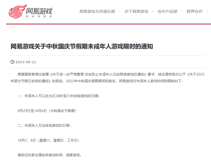 一、未成年人可以在当日20时至21时体验游戏的日期:9月29日至10月6日(中秋国庆节假期)