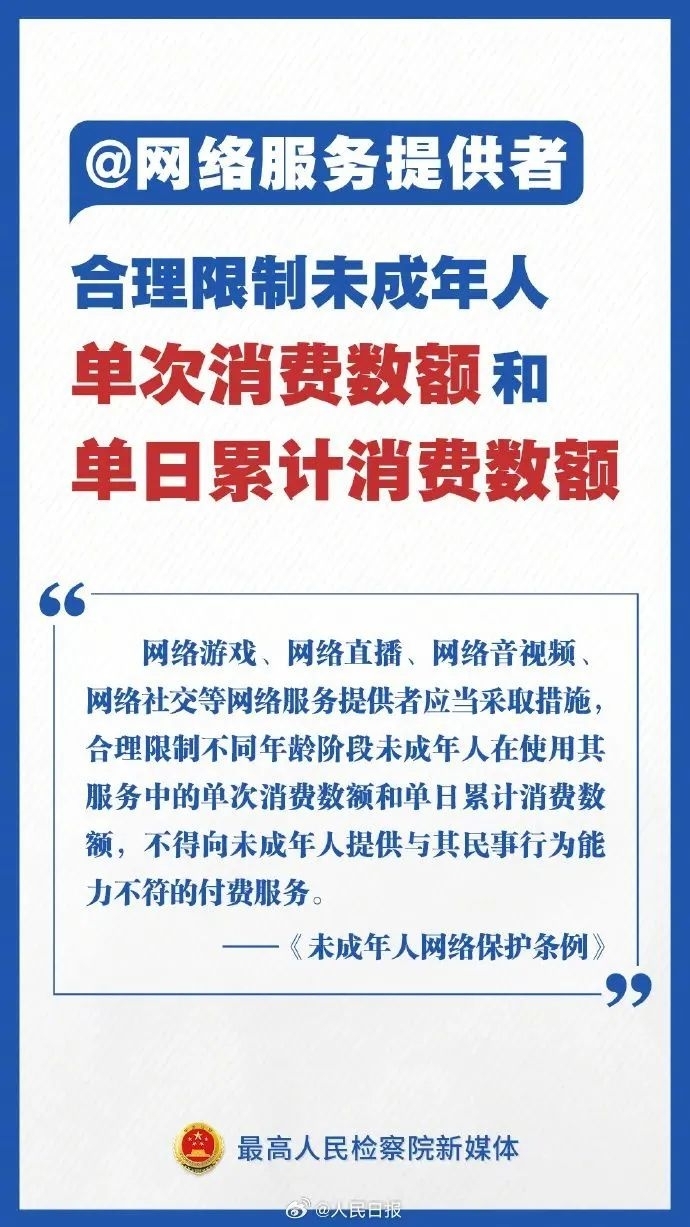 ▪规定网络服务提供者应当合理限制不同年龄阶段未成年人在使用其服务中的消费数额,防范和抵制流量至上等不良价值倾向。