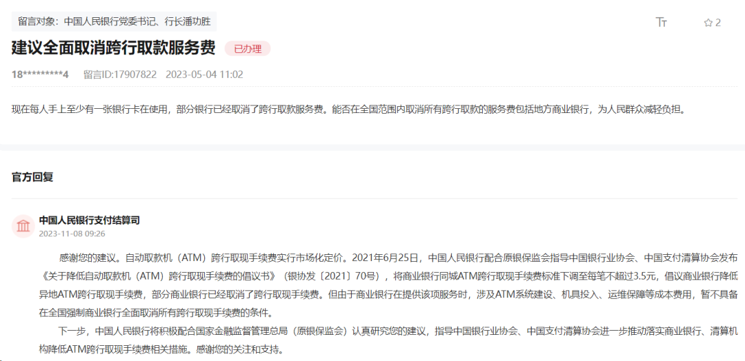 网友在留言中表示,现在每人手上至少有一张银行卡在使用,部分银行已经取消了跨行取款服务费。“能否在全国范围取消包括地方商业银行在内的所有跨行取款服务费,为人民群众减轻负担。”