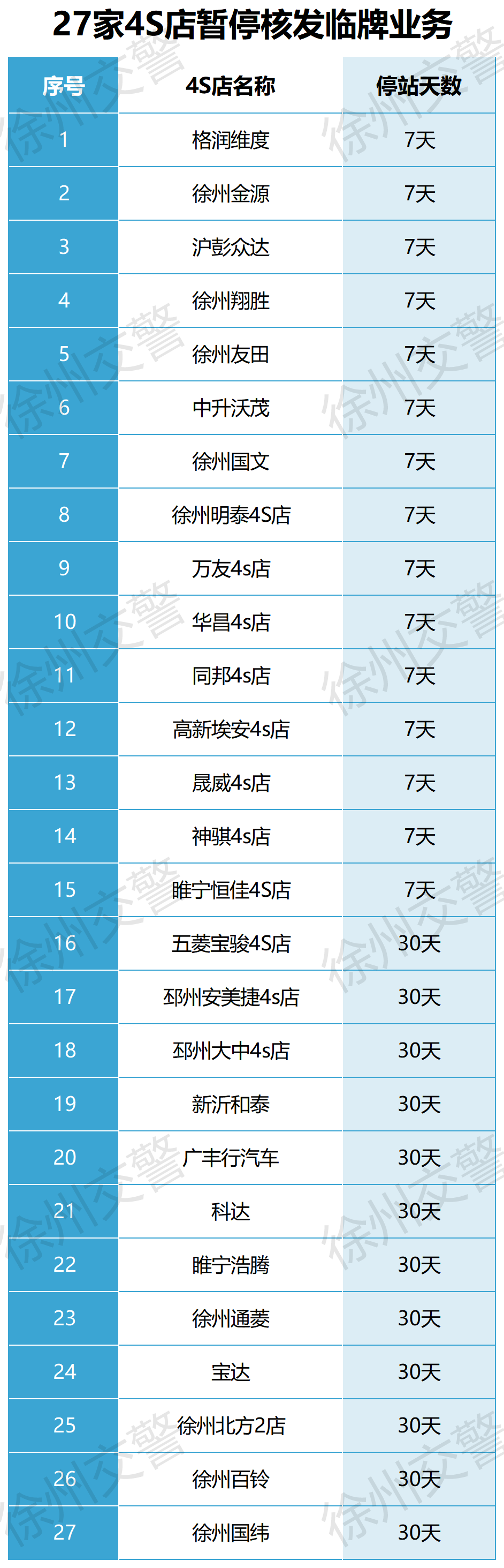 为进一步规范机动车登记业务办理,提升服务质效和群众满意度,徐州市交警支队车管所在工作中发现27家4S店、6家机动车登记服务站在业务办理过程中违反《机动车登记服务站管理规定》的行为。根据相关规定,对27家4S店、6家机动车登记服务站暂停业务办理: