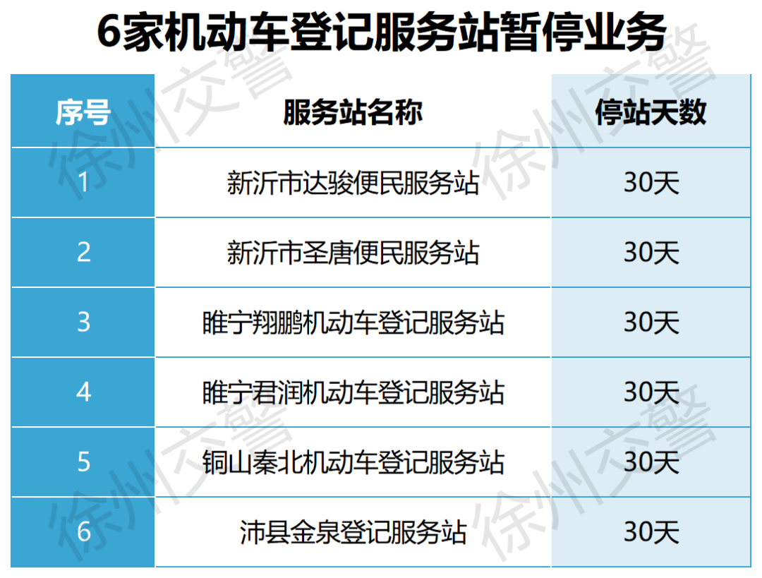 3、从2023年11月16日至12月15日,暂停新沂达骏便民服务站、新沂圣唐登记服务站、睢宁翔鹏登记服务站、睢宁君润登记服务站、铜山秦北登记服务站、沛县金泉登记服务站共6家机动车登记服务站业务办理。群众办理相关业务可就近前往其他机动车登记服务站办理。由此带来不便,敬请谅解!特此公告。