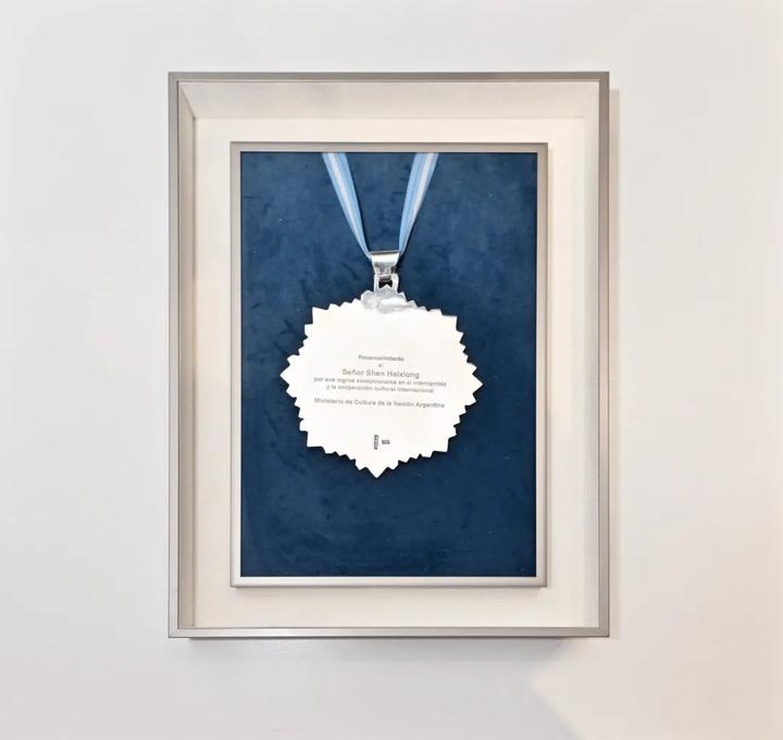 阿根廷本届政府向中央广播电视总台台长颁授的“国际人文交流合作杰出成就奖”奖章为925纯银制成,主体直径13厘米,为阿根廷知名银饰设计师帕塔卡之作。