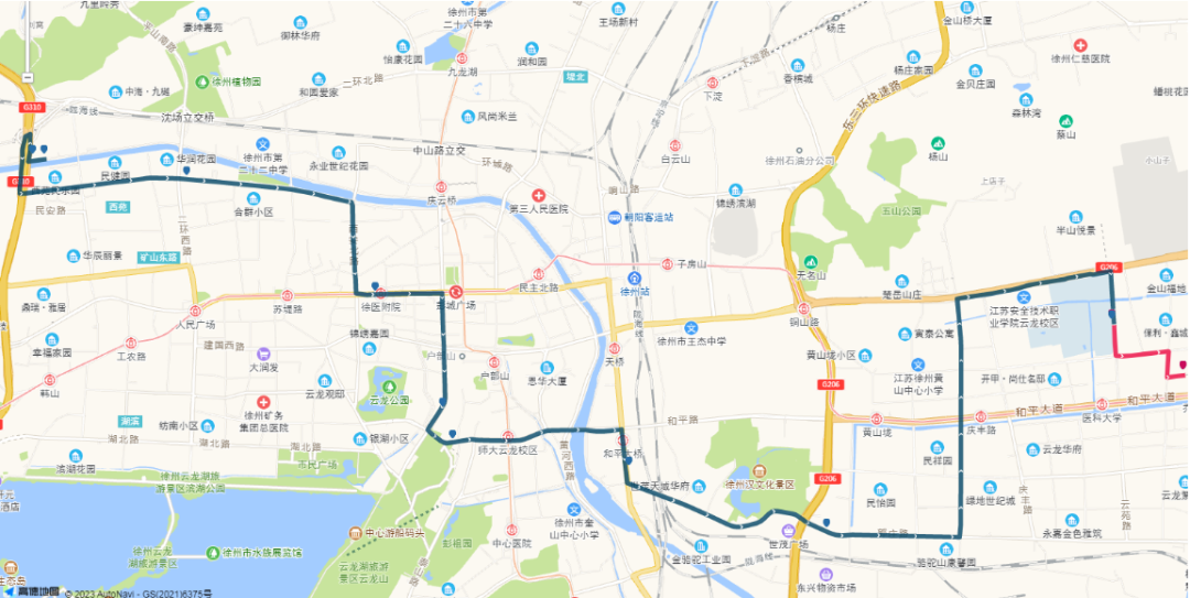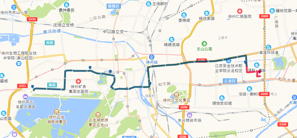 途经道路:湖北路、二环西路、建国西路、王陵路、中山南路、和平路、复兴南路、铜山路、徐海路、云苑路、黄山大道等