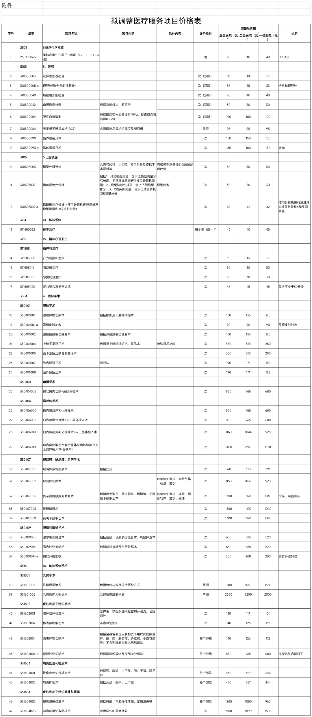 为进一步理顺医疗服务比价关系,不断优化医疗服务价格结构,我局按照“总量控制、结构调整、有升有降、逐步到位”原则,对眼部诊疗、体被系统、精神心理卫生等部分市定价医疗服务项目价格进行调整,现将调整价格予以公示。