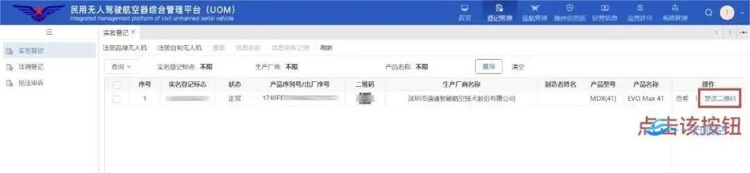 完成注册后,可在实名登记页面中查询到已完成注册登记的无人机,点击右侧 [发送二维码] 按钮。填写邮箱,下载附件并打印,将二维码粘贴至该无人机的机身上。