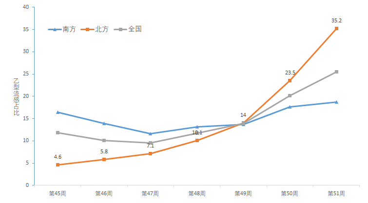 图 南北方及全国乙型流感占比示意图
