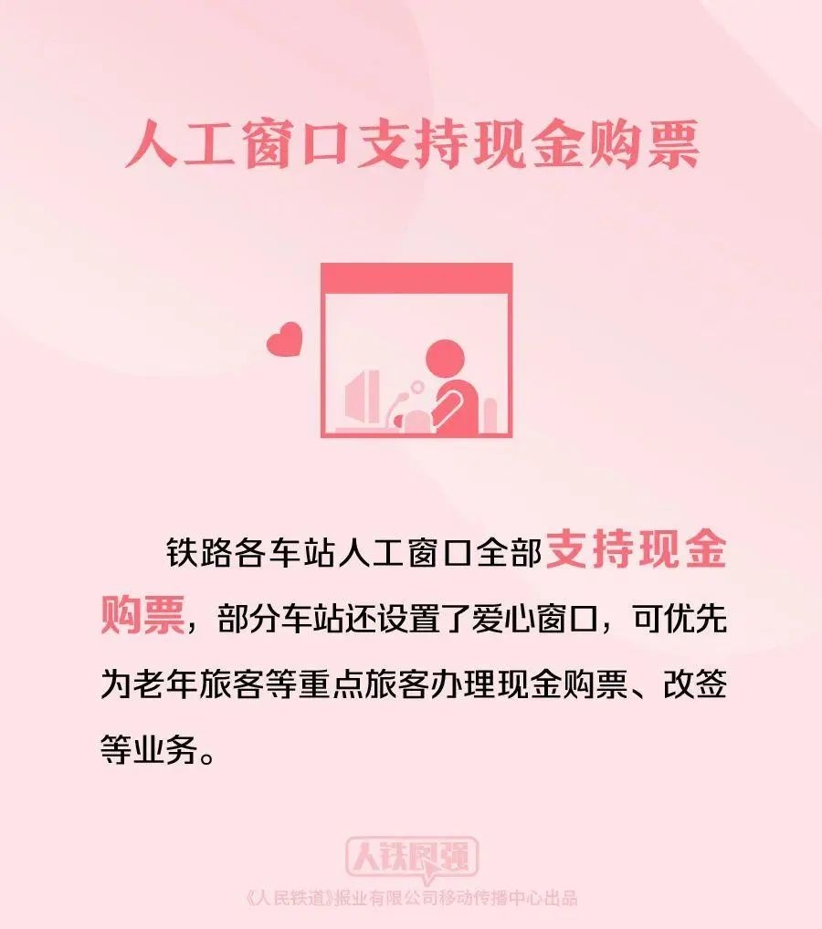 铁路各车站人工窗口全部支持现金购票,部分车站还设置了爱心窗口,可优先为老年旅客等重点旅客办理现金购票、改签等业务。